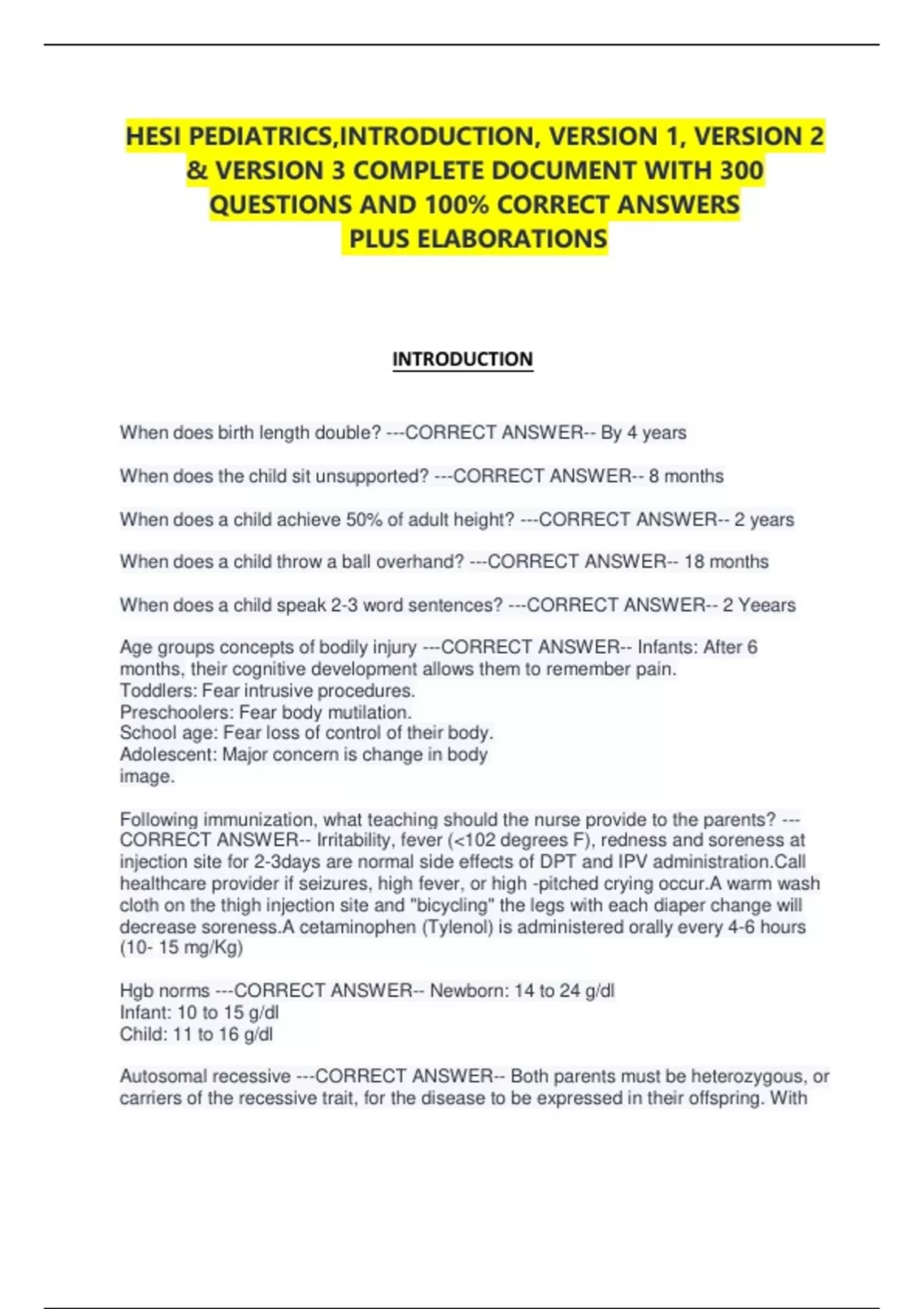 HESI PEDIATRICS,INTRODUCTION, VERSION 1, VERSION 2 & VERSION 3 COMPLETE DOCUMENT WITH 300 QUESTIONS AND 100% CORRECT ANSWERS PLUS ELABORATIONS