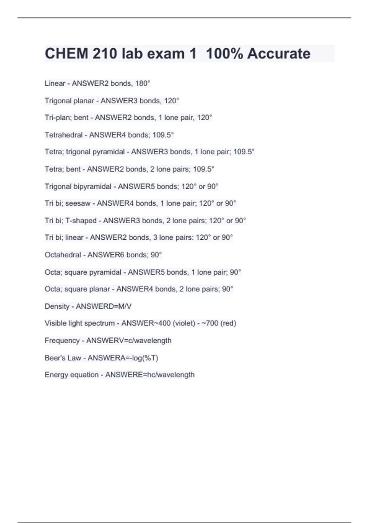 CHEM 210 lab exam 1 100% Accurate Linear - ANSWER2 bonds, 180°