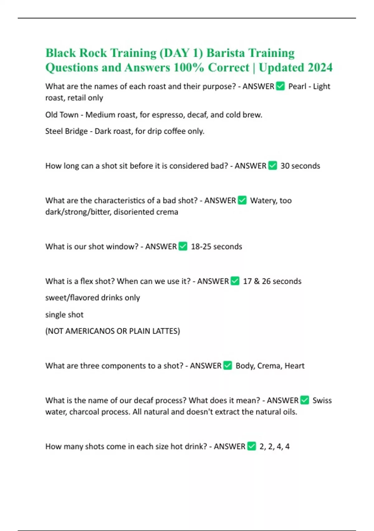 Black Rock Training (DAY 1) Barista Training Questions and Answers 100% Correct | Updated 2024