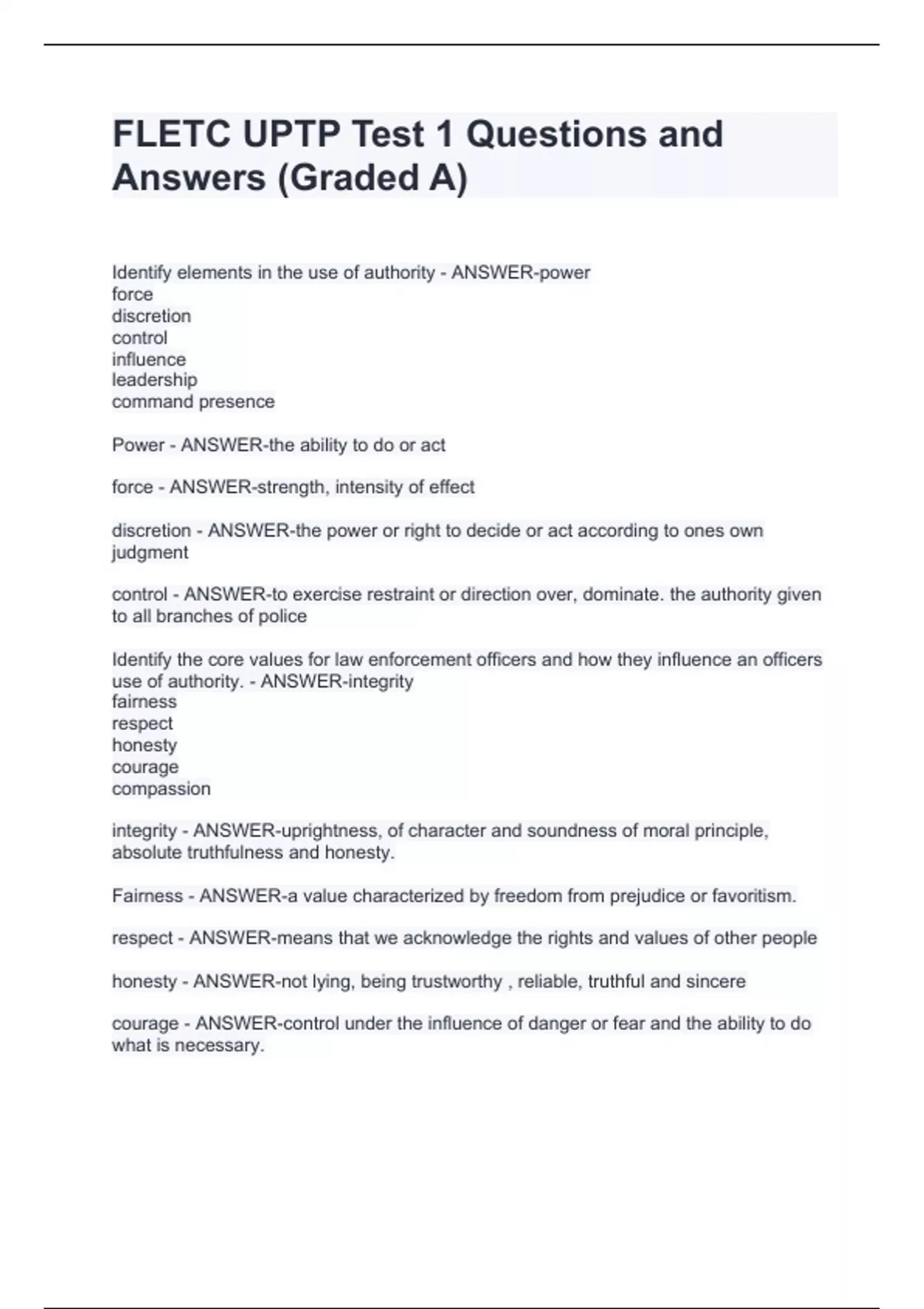 FLETC UPTP Test 1 Questions and Answers (Graded A)FLETC UPTP Test 1 Questions and Answers (Graded A)FLETC UPTP Test 1 Questions and Answers (Graded A)FLETC UPTP Test 1 Questions and Answers (Graded A)FLETC UPTP Test 1 Questions and Answers (Graded A) Identify elements in the use of authority - ANSWER-power force discretion control influence leadership command presence Power - ANSWER-the ability to do or act force - ANSWER-strength, intensity of effect discretion - ANSWER-the power or right to decide or act according to ones own