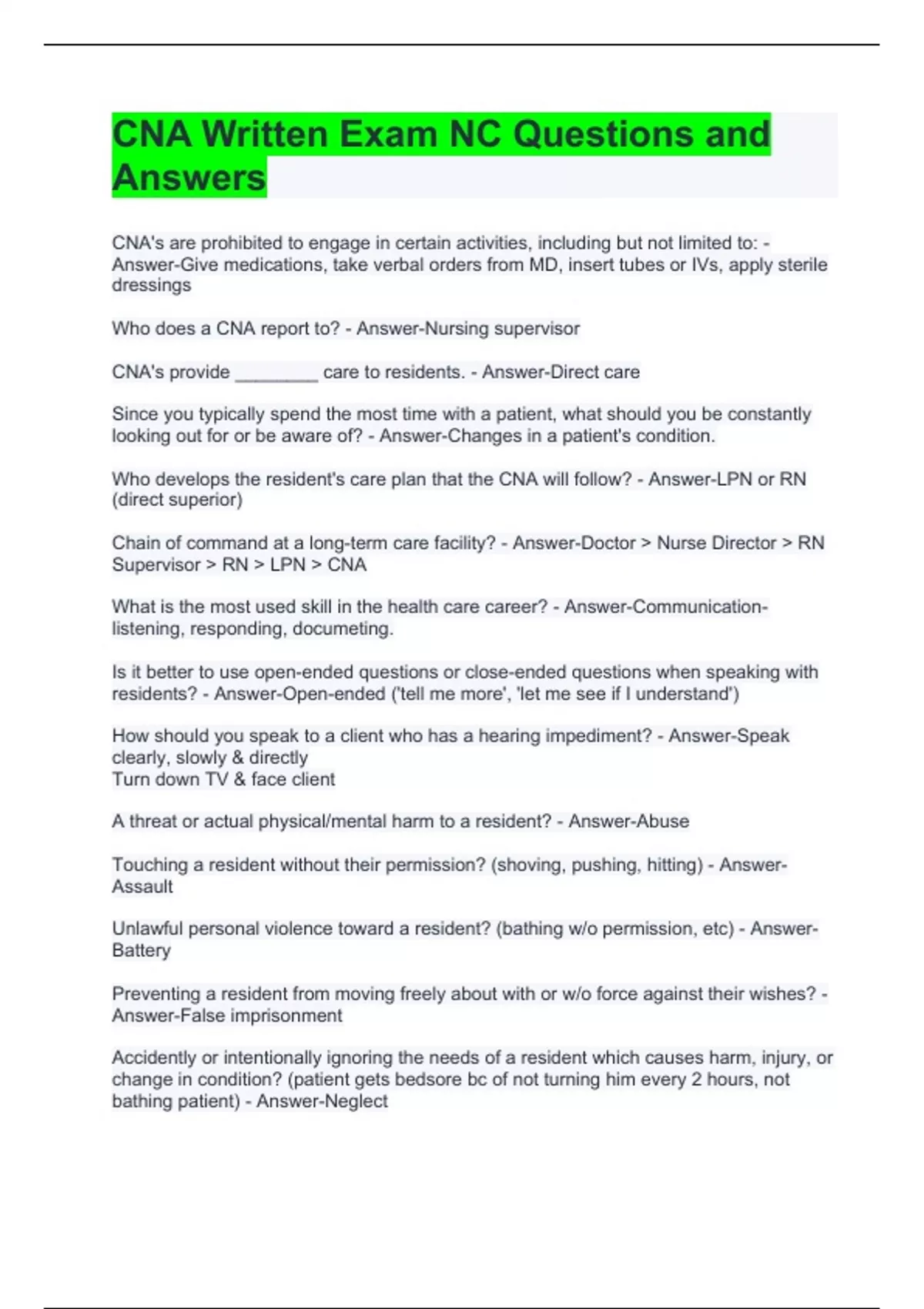CNA Written Exam NC Questions and Answers