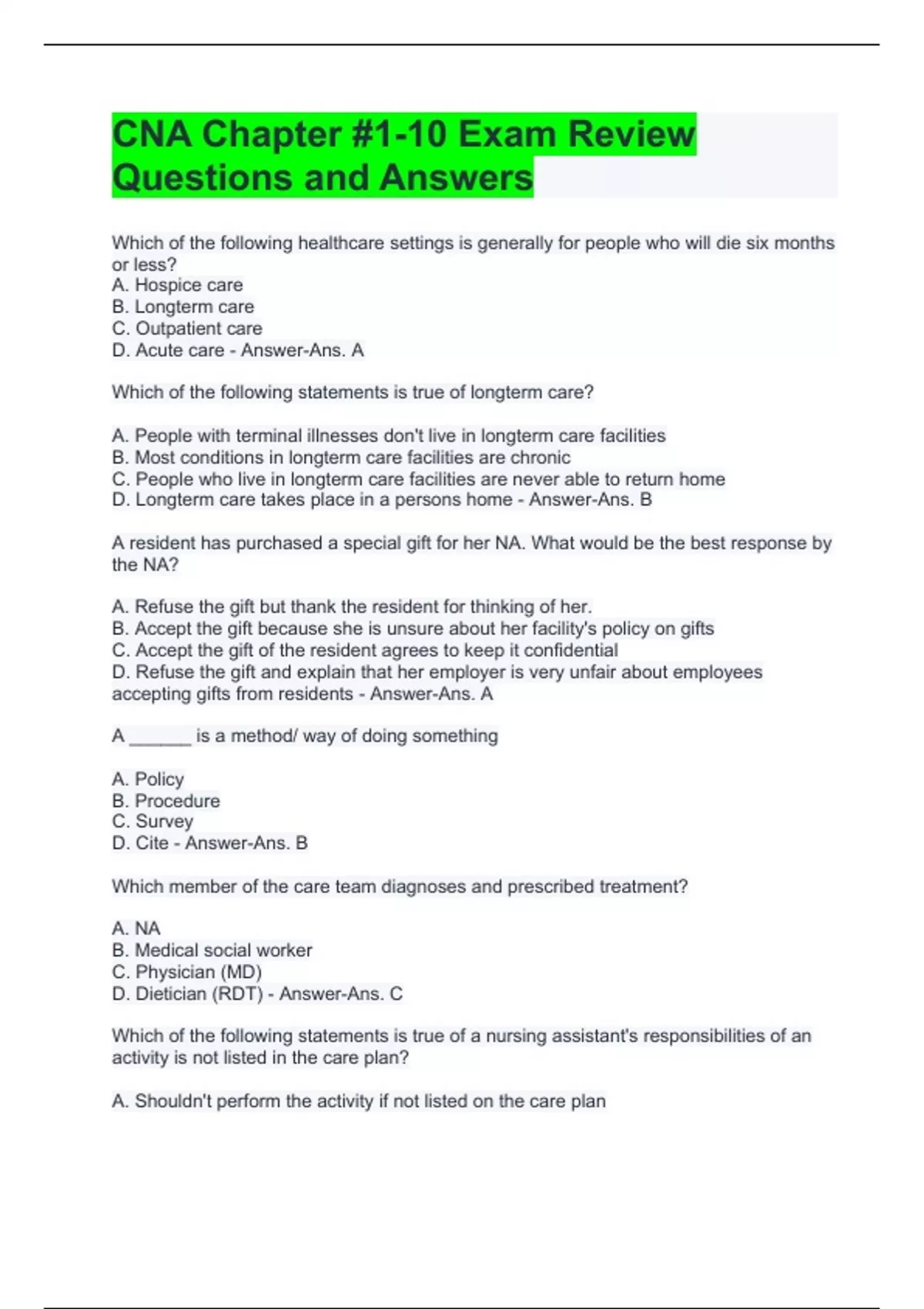 CNA Chapter #1-10 Exam Review Questions and Answers