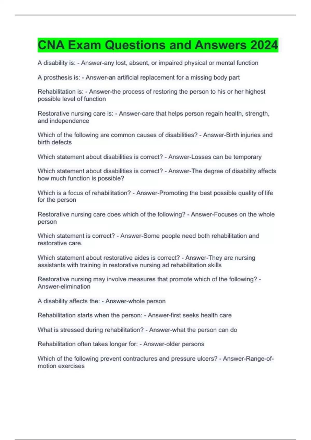 CNA Exam Questions and Answers 2024