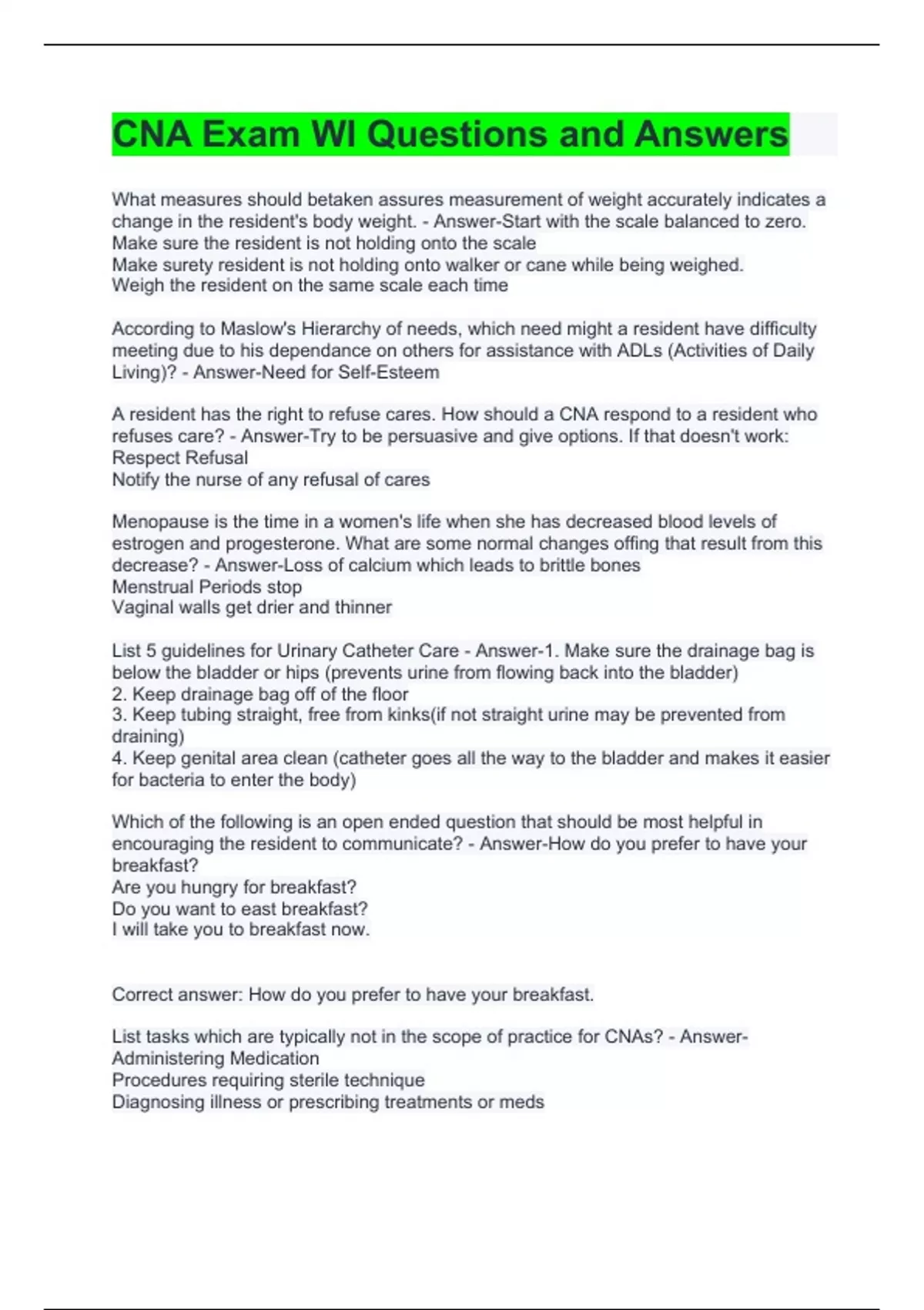 cna exam wi questions and answers