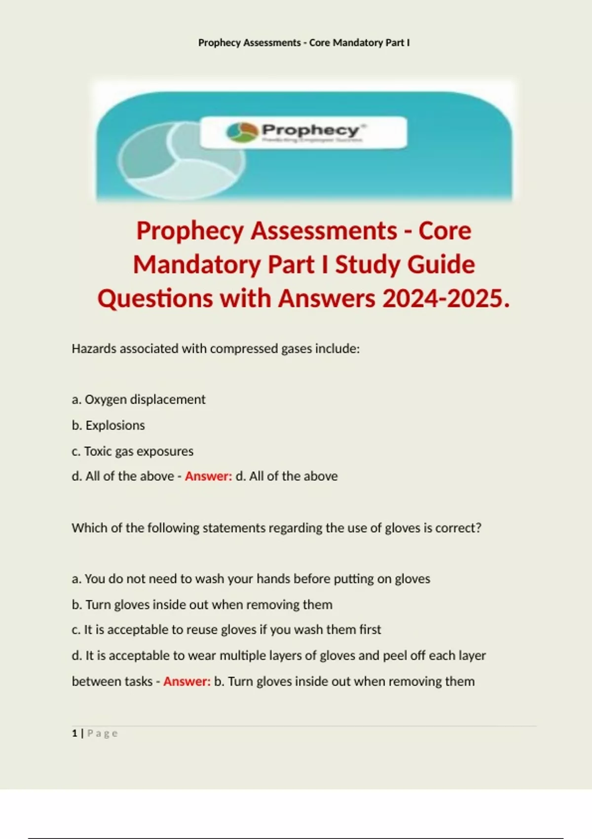 Prophecy Assessments - Core Mandatory Part I Study Guide Questions with Answers . Terms like: Hazards associated with compressed gases include: a. Oxygen displacement b. Explosions c. Toxic gas exposures d. All of the above - Answer: d. All of the above