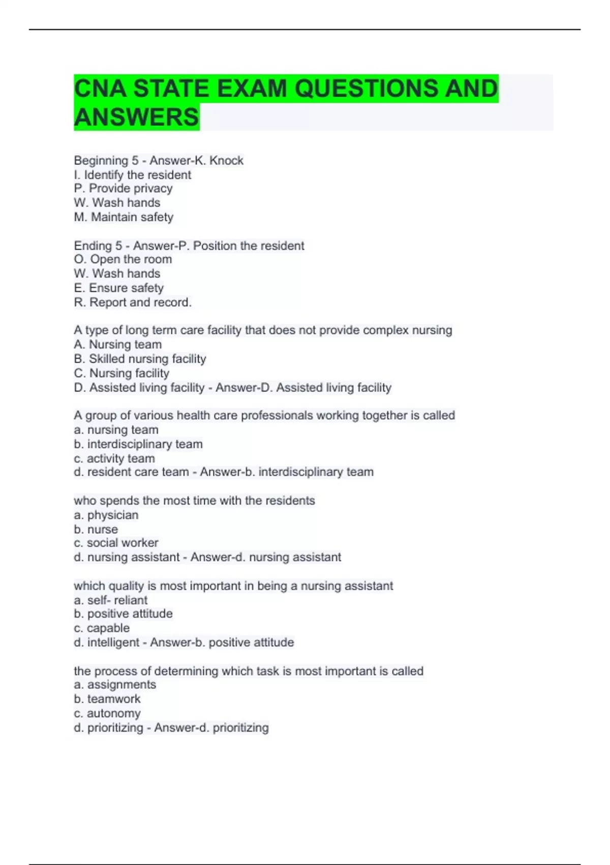 CNA STATE EXAM QUESTIONS AND ANSWERS