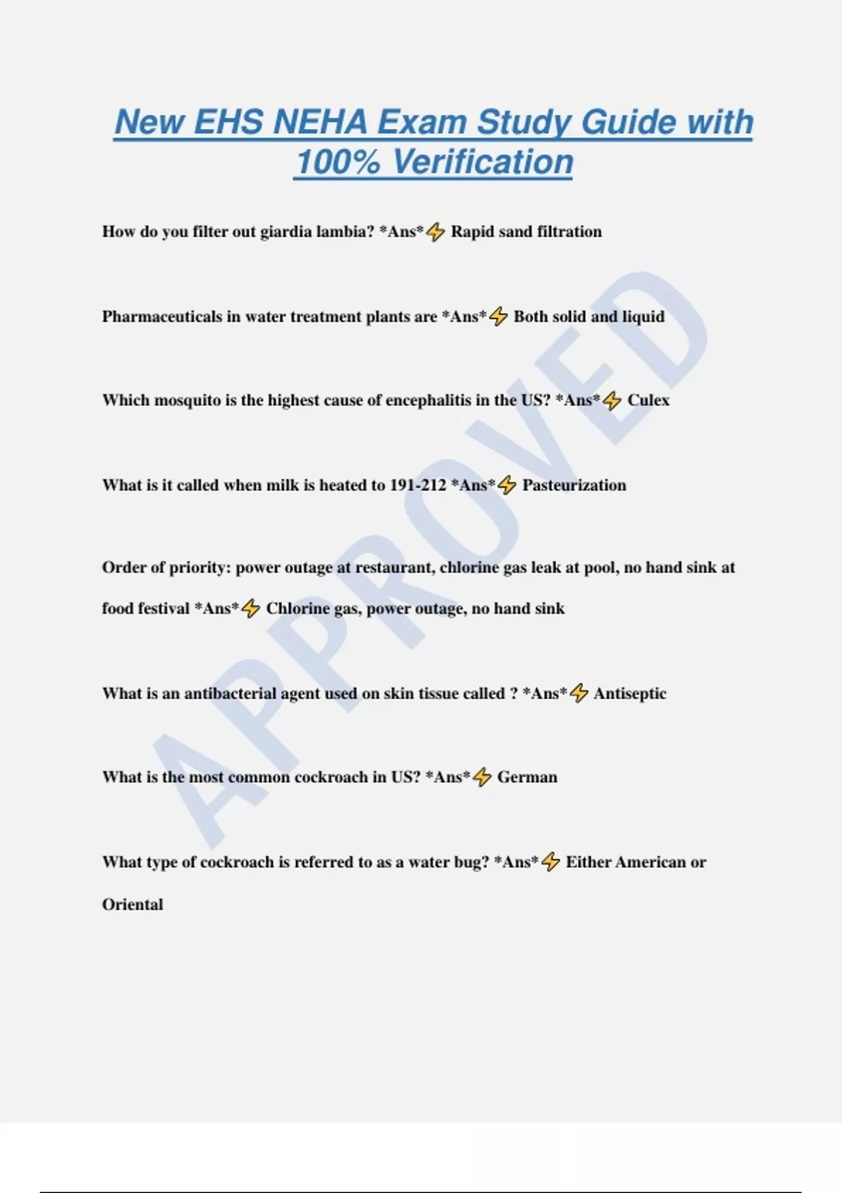 New EHS NEHA Exam Study Guide with 100% Verification How do you filter out giardia lambia? *Ans* Rapid sand filtration Pharmaceuticals in water treatment plants are *Ans* Both solid and liquid Which mosquito is the highest cause of encephalitis in the US? *Ans* Culex What is it called when milk is heated to 191-212 *Ans* Pasteurization Order of priority: power outage at restaurant, chlorine gas leak at pool, no hand sink at food festival *Ans* Chlorine gas, power outage, no hand sink What is an antibacterial agent used on skin tissue called ? *Ans* Antiseptic What is the most common cockroach in US? *Ans* German What type of cockroach is referred to as a water bug? *Ans* Either American or Oriental What is the minimum distance between a water line and a sewer line in a trailer park? *Ans* 10 ft What is the slope for ramps determined by the Americans with Disabilities Act (ADA) *Ans* 1:12 or less NSF and USL are organizations that *Ans* Certify food service equipment. What is the amount of soil you must put on a finished landfill *Ans* 24 inches What is most likely to carry Hantavirus? *Ans* Rodents Which is least likely to cause bites and itching in an urban setting *Ans* Ticks What does HACCP stand for? *Ans* Hazard Analysis and Critical Control Points Methemoglobinemia (a blood disorder) is caused by : *Ans* Nitrates Hazardous waste : CRIT *Ans* Corrosive, reactive, ignitable, toxic Organization that tests breathing appara