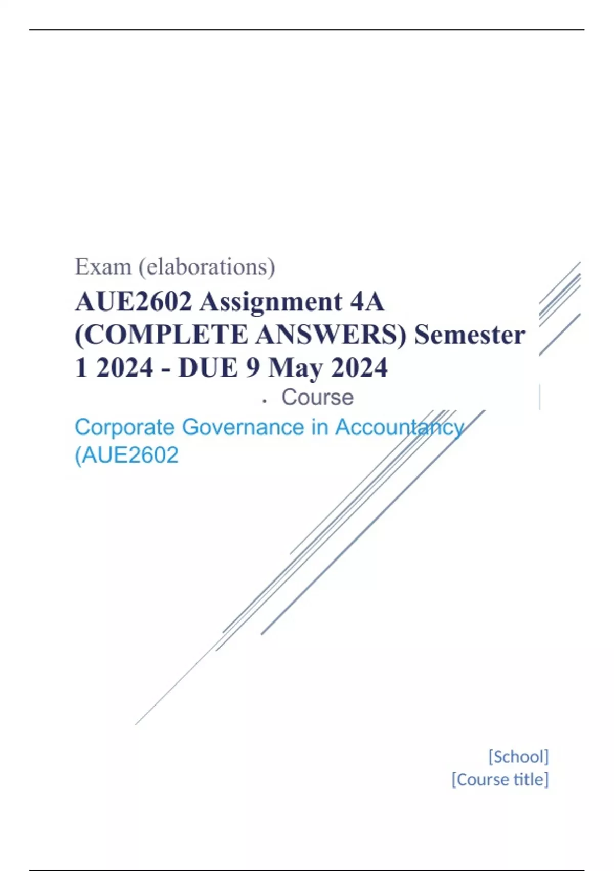 Exam (elaborations) AUE2602 Assignment 4A (COMPLETE ANSWERS) Semester 1 2024 - DUE 9 May 2024 • Course • Corporate Governance in Accountancy (AUE2602) • Institution • University Of South Africa (Unisa) • Book • Auditing Notes for South African Students AU