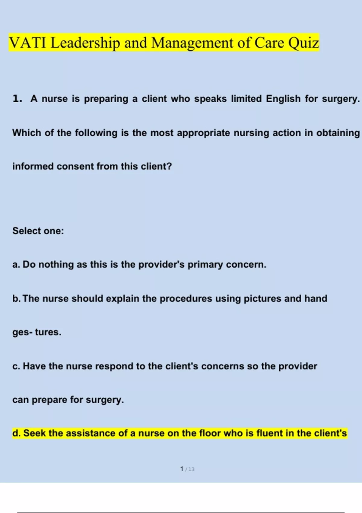 Leadership and Management of Care Quiz VATI Exam Questions and Correct Answers 100% Complete 2024/2025
