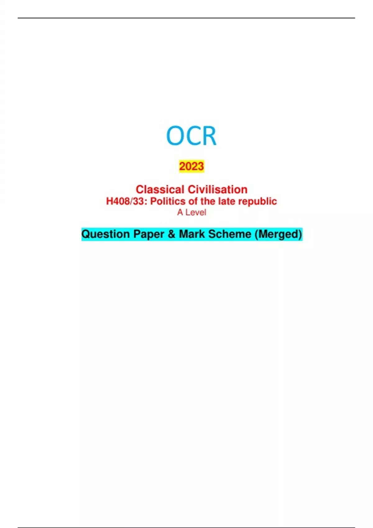 OCR 2023 Classical Civilisation H408/33: Politics of the late republic A Level Question Paper & Mark Scheme (Merged