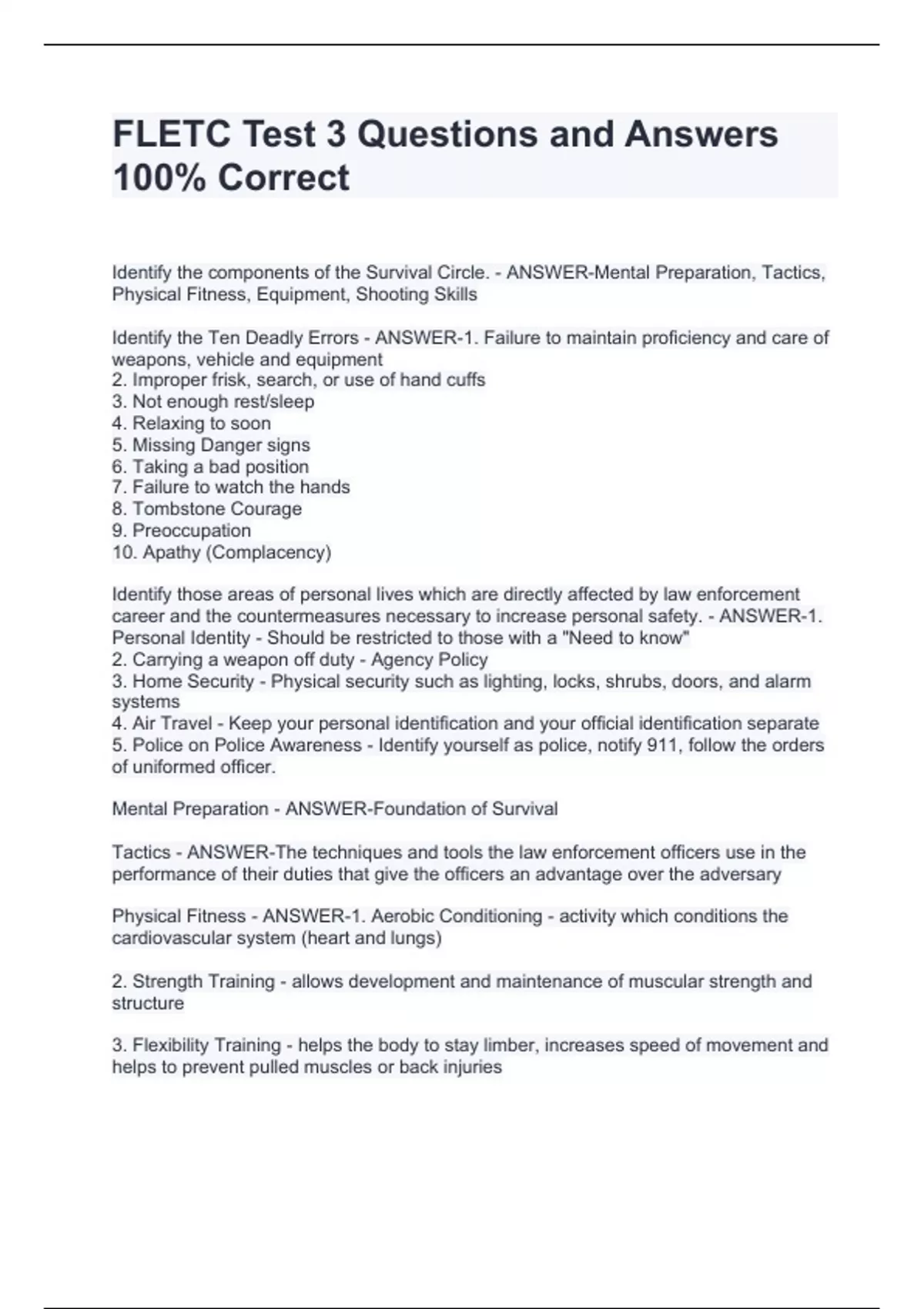 FLETC Test 3 Questions and Answers 100% CorrectFLETC Test 3 Questions and Answers 100% CorrectFLETC Test 3 Questions and Answers 100% CorrectFLETC Test 3 Questions and Answers 100% CorrectFLETC Test 3 Questions and Answers 100% CorrectFLETC Test 3 Questions and Answers 100% Correct Identify the components of the Survival Circle. - ANSWER-Mental Preparation, Tactics, Physical Fitness, Equipment, Shooting Skills Identify the Ten Deadly Errors - ANSWER-1. Failure to maintain proficiency and care of weapons, vehicle and equipment 2. Improper frisk, search, or use of hand cuffs 3. Not enough rest/sleep 4. Relaxing to soon 5. Missing Danger signs 6. Taking a bad position 7. Failure to watch the hands 8. Tombstone Courage 9. Preoccupation 10. Apathy (Complacency) Identify those areas of personal lives which are directly affected by law enforcement career and the countermeasures necessary to increase personal safety. - ANSWER-1.