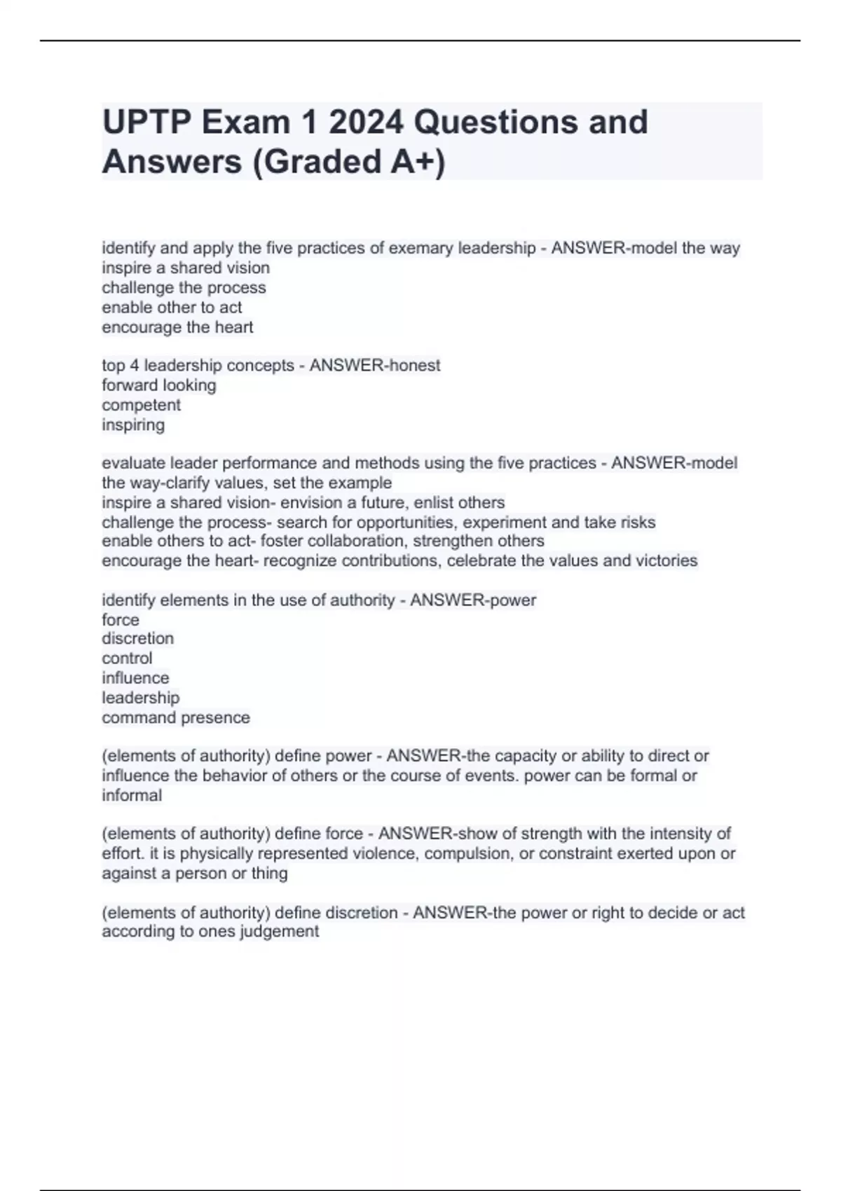 identify and apply the five practices of exemary leadership - ANSWER-model the way inspire a shared vision challenge the process enable other to act encourage the heart top 4 leadership concepts - ANSWER-honest forward looking competent inspiring evaluate leader performance and methods using the five practices - ANSWER-model the way-clarify values, set the example inspire a shared vision- envision a future, enlist others challenge the process- search for opportunities, experiment and take risks enable others to act- foster collaboration, strengthen others encourage the heart- recognize contributions, celebrate the values and victories identify elements in the use of authority - ANSWER-power force discretion control influence leadership command presence (elements of authority) define power - ANSWER-the capacity or ability to direct or influence the behavior of others or the course of events. power can be formal or informal (elements of authority) define force - ANSWER-show of strength with the intensity of effort. it is physically represented violence, compulsion, or constraint exerted upon or against a person or thing (elements of authority) define discretion - ANSWER-the power or right to decide or act according to ones judgement (elements of authority) define control - ANSWER-to exercise restraint or direction over domi
