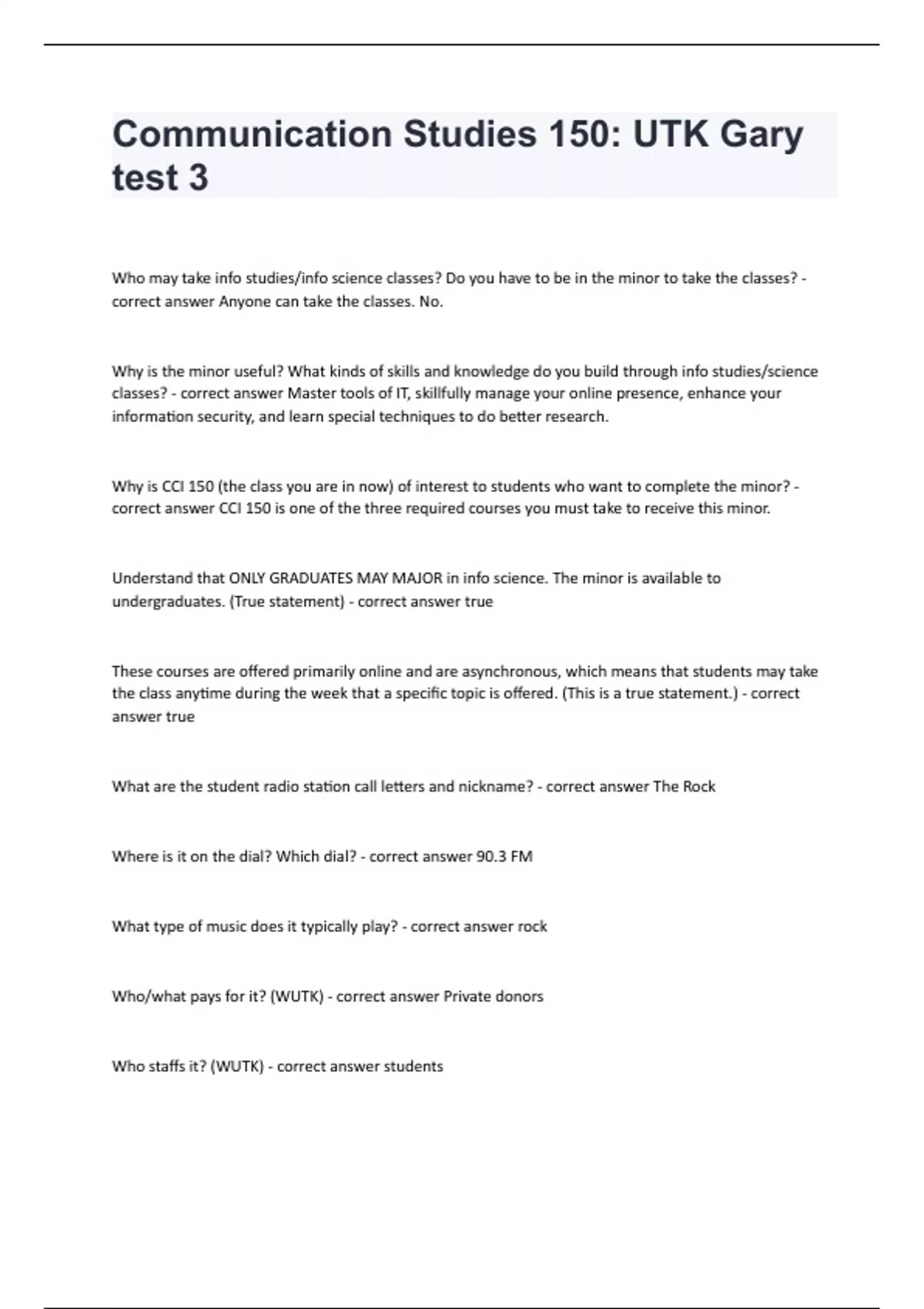 UTK CCI 150 Liberty University -Communication Studies 150: UTK Gary test 3 with answers 100%Who may take info studies/info science classes? Do you have to be in the minor to take the classes? - correct answer Anyone can take the classes. No. Why is the minor useful? What kinds of skills and knowledge do you build through info studies/science classes? - correct answer Master tools of IT, skillfully manage your online presence, enhance your information security, and learn special techniques to do better research. Why is CCI 150 (the class you are in now) of interest to students who want to complete the minor? - correct answer CCI 150 is one of the three required courses you must take to receive this minor. Understand that ONLY GRADUATES MAY MAJOR in info science. The minor is available to undergraduates. (True statement) - correct answer true These courses are offered primarily online and are asynchronous, which means that students may take the class anytime during the week that a specific topic is offered. (This is a true statement.) - correct answer true What are the student radio station call letters and nickname? - correct answer The Rock Where is it on the dial? Which dial? - correct answer 90.3 FM What type of music does it typically play? - correct answer rock Who/what pays for it? (WUTK) - correct answer Private donors Who staffs it? (WUTK) - correct answer students
