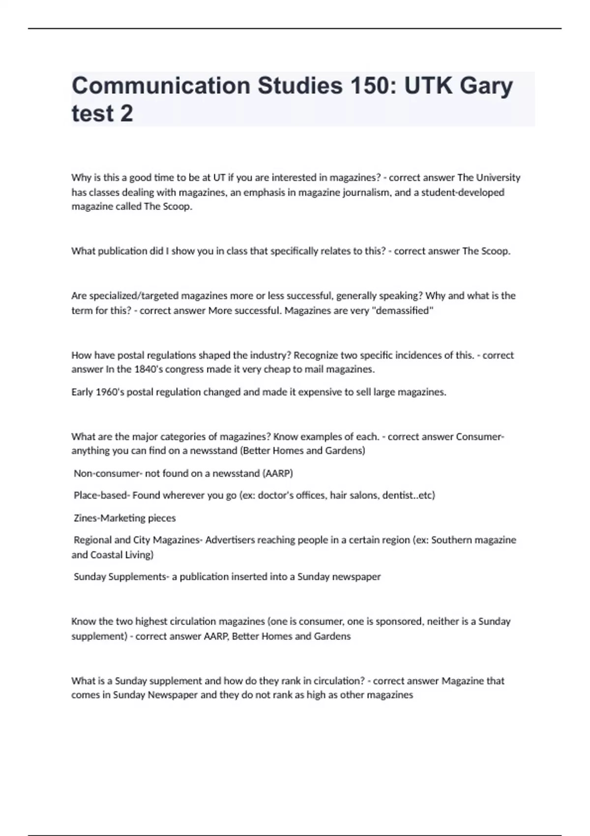 UTK CCI 150 Liberty University -Communication Studies 150: UTK Gary test 2Why is this a good time to be at UT if you are interested in magazines? - correct answer The University has classes dealing with magazines, an emphasis in magazine journalism, and a student-developed magazine called The Scoop. What publication did I show you in class that specifically relates to this? - correct answer The Scoop. Are specialized/targeted magazines more or less successful, generally speaking? Why and what is the term for this? - correct answer More successful. Magazines are very "demassified" How have postal regulations shaped the industry? Recognize two specific incidences of this. - correct answer In the 1840's congress made it very cheap to mail magazines. Early 1960's postal regulation changed and made it expensive to sell large magazines. What are the major categories of magazines? Know examples of each. - correct answer Consumer- anything you can find on a newsstand (Better Homes and Gardens) Non-consumer- not found on a newsstand (AARP) Place-based- Found wherever you go (ex: doctor's offices, hair salons, dentist..etc) Zines-Marketing pieces Regional and City Magazines- Advertisers reaching people in a certain region (ex: Southern magazine and Coastal Living) Sunday Supplements- a publication inserted into a Sunday newspaper Know the two highest circulation magazines (one is consumer, one is sponsored, neither is a Sunday supplement) - correct answer AARP, Better Homes and Gardens What is a Sunday supplement and how do they rank in circulation? - correct answer Magazine that comes in Sunday Newspaper and they do not rank as high as other magazines