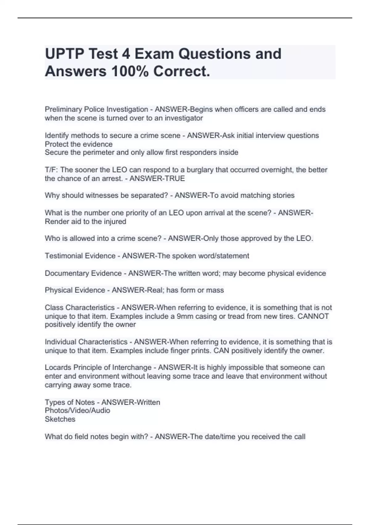 Preliminary Police Investigation - ANSWER-Begins when officers are called and ends when the scene is turned over to an investigator Identify methods to secure a crime scene - ANSWER-Ask initial interview questions Protect the evidence Secure the perimeter and only allow first responders inside T/F: The sooner the LEO can respond to a burglary that occurred overnight, the better the chance of an arrest. - ANSWER-TRUE Why should witnesses be separated? - ANSWER-To avoid matching stories What is the number one priority of an LEO upon arrival at the scene? - ANSWER-Render aid to the injured Who is allowed into a crime scene? - ANSWER-Only those approved by the LEO. Testimonial Evidence - ANSWER-The spoken word/statement Documentary Evidence - ANSWER-The written word; may become physical evidence Physical Evidence - ANSWER-Real; has form or mass Class Characteristics - ANSWER-When referring to evidence, it is something that is not unique to that item. Examples include a 9mm casing or tread from new tires. CANNOT positively identify the owner Individual Characteristics - ANSWER-When referring to evidence, it is something that is unique to that item. Examples include finger prints. CAN positively identify the owner. Locards Principle of Interchange - ANSWER-It is highly impossible that someone can enter and environment without leaving some trace and leave that environment without carrying away some trace. Types of Notes - ANSWER-Written Photos/Video/Audio Sketches