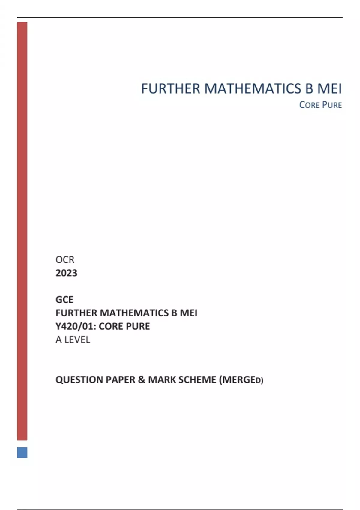 OCR 2023 GCE FURTHER MATHEMATICS B MEI Y420/01: CORE PURE A LEVEL QUESTION PAPER & MARK SCHEME (MERGED)