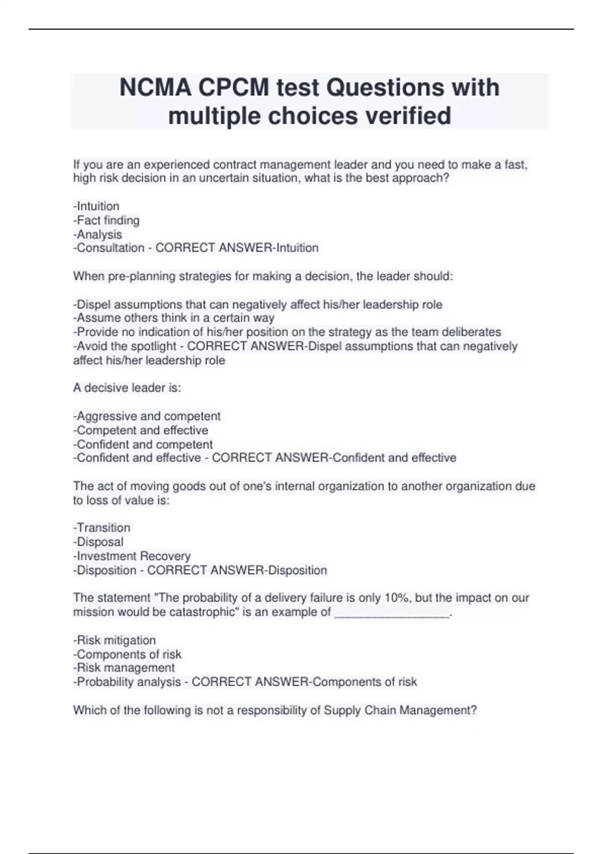 NCMA CPCM test Questions with multiple choices verified If you are an experienced contract management leader and you need to make a fast, high risk decision in an uncertain situation, what is the best approach? -Intuition -Fact finding -Analysis -Consultation - CORRECT ANSWER-Intuition When pre-planning strategies for making a decision, the leader should: -Dispel assumptions that can negatively affect his/her leadership role -Assume others think in a certain way -Provide no indication of his/her position on the strategy as the team deliberates -Avoid the spotlight - CORRECT ANSWER-Dispel assumptions that can negatively affect his/her leadership role A decisive leader is: -Aggressive and competent -Competent and effective -Confident and competent -Confident and effective - CORRECT ANSWER-Confident and effective The act of moving goods out of one's internal organization to another organization due to loss of value is: -Transition -Disposal -Investment Recovery -Disposition - CORRECT ANSWER-Disposition The statement "The probability of a delivery failure is only 10%, but the impact on our mission would be catastrophic" is an example of _________________. -Risk mitigation -Components of risk -Risk management -Probability analysis - CORRECT ANSWER-Components of risk Which of the following is not a responsibility of Supply Chain Management? -Standardizing requirements -Achieve low cost contracts -Maximizing quality -Foster cross-functional relationships - CORRECT ANSWER-Achieve low cost contracts An Organizational Conflict of Interest exists when: -Only one contractor is competing for the contract -More than one contractor is incentivized to compete for a contract -The nature of the work to be performed under a contract may result in an unfair competitive advantage to the contractor -The contractor selected for award will have an unfair competitive advantage for future work. - CORRECT ANSWER-The nature of the work to be performed under a contract may result in an unfair competitive advantage to the contractor No debt may be paid out of public funds unless Congress has made an ______________ for that purpose. -Authorization -Allotment -Obligation -Appropriation - CORRECT ANSWER-Appropriation Which of the following describes perfect competition? -Many independent buyers, few independent sellers, easy entry to market balanced pricing between buyers and sellers -Many independent buyers, many independent sellers, moderate entry to market, balanced costs between buyers and sellers -Some independent buyers, some independent sellers, moderate entry to market, balanced pricing between buyers and sellers -Many independent buyers, many independent sellers, easy entry to market, balanced pricing between buyers and sellers - CORRECT ANSWER-Many independent buyers, many independent sellers, easy entry to market, balanced pricing between buyers and sellers A brief statement of the goal to be achieved, the end product desired, or the basic purpose of a requirement is called what? -Statement of Work -Acquisition plan -Scope -Objective - CORRECT ANSWER-Objective