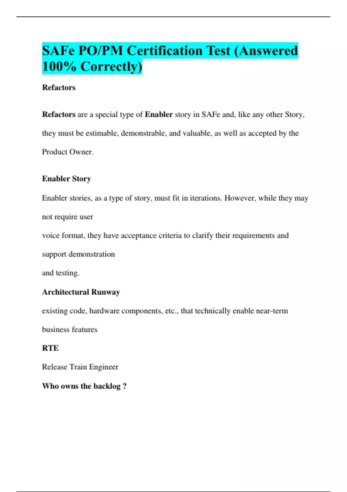 SAFe PO/PM Certification Test (Answered 100% Correctly) Refactors Refactors are a special type of Enabler story in SAFe and, like any other Story, they must be estimable, demonstrable, and valuable, as well as accepted by the Product Owner. Enabler Story Enabler stories, as a type of story, must fit in iterations. However, while they may not require user voice format, they have acceptance criteria to clarify their requirements and support demonstration and testing. Architectural Runway existing code, hardware components, etc., that technically enable near-term business features RTE Release Train Engineer Who owns the backlog ? Team backlog =product owner (contains stories) Program backlog= Product manager (contains features) Portfolio backlog=highest level- contains epics, RTE Five core competencies Organizational Agility*new Lean Portfolio Management Enterprise Solution Delivery (Business solutions and Lean system engineering) Agile Product Delivery (DevOps and Release on Demand) Team and Technical Agility Lean-Agile Leadership** Continuous Learning Culture*new Portfolio Sync Adjusting value stream funding Reviewing the portfolio Kanban and lightweight business cases, approving and prioritizing epics Maintaining the portfolio vision and canvas Removing impediments across value streams Considering the results of MVPs and determining whether to pivot or persevere Reviewing the progress of continuous improvement efforts to drive operational excellence Evaluating spend by investment horizon Capacity Allocation A qualitative guardrail to determine how much of the total effort can be allocated for each type of activity for an upcoming PI, establishing an agreement to determine how the work is performed for each activity type (new features, enablers, tech debt and maintenance System and Solution Architect/Engineer (design Authority) Product and Solution Management (Content Authority) Lean Portfolio Management creates strategic alignment (LPM) (core competency) The Lean Portfolio Management competency aligns strategy and execution by applying Lean and systems thinking approaches to strategy and investment funding, Agile portfolio operations, and governance. These collaborations give the enterprise the ability to align strategy to execution, to meet existing commitments reliably, and to better enable innovation. 3 dimensions= 1-Strategy and investment funding