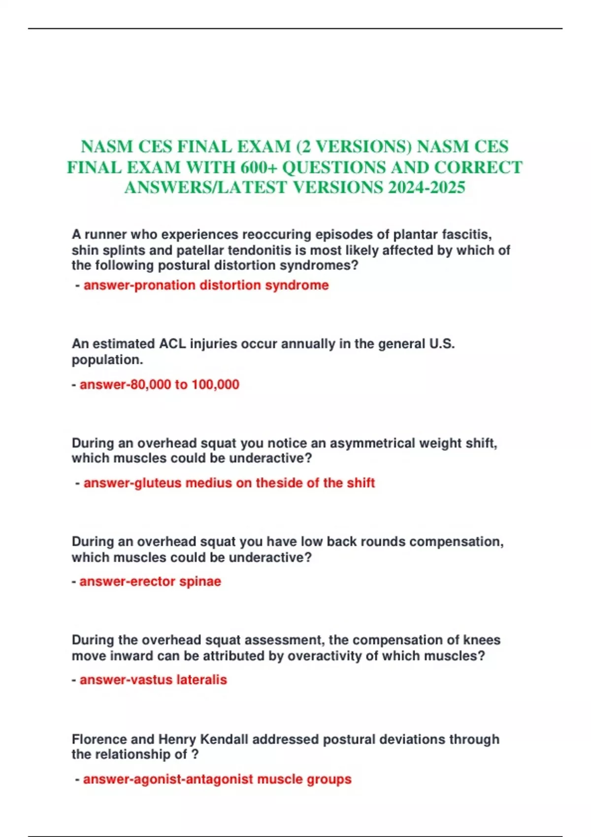 NASM CES FINAL EXAM (2 VERSIONS) NASM CES FINAL EXAM WITH 600+ QUESTIONS AND CORRECT ANSWERS/LATEST VERSIONS