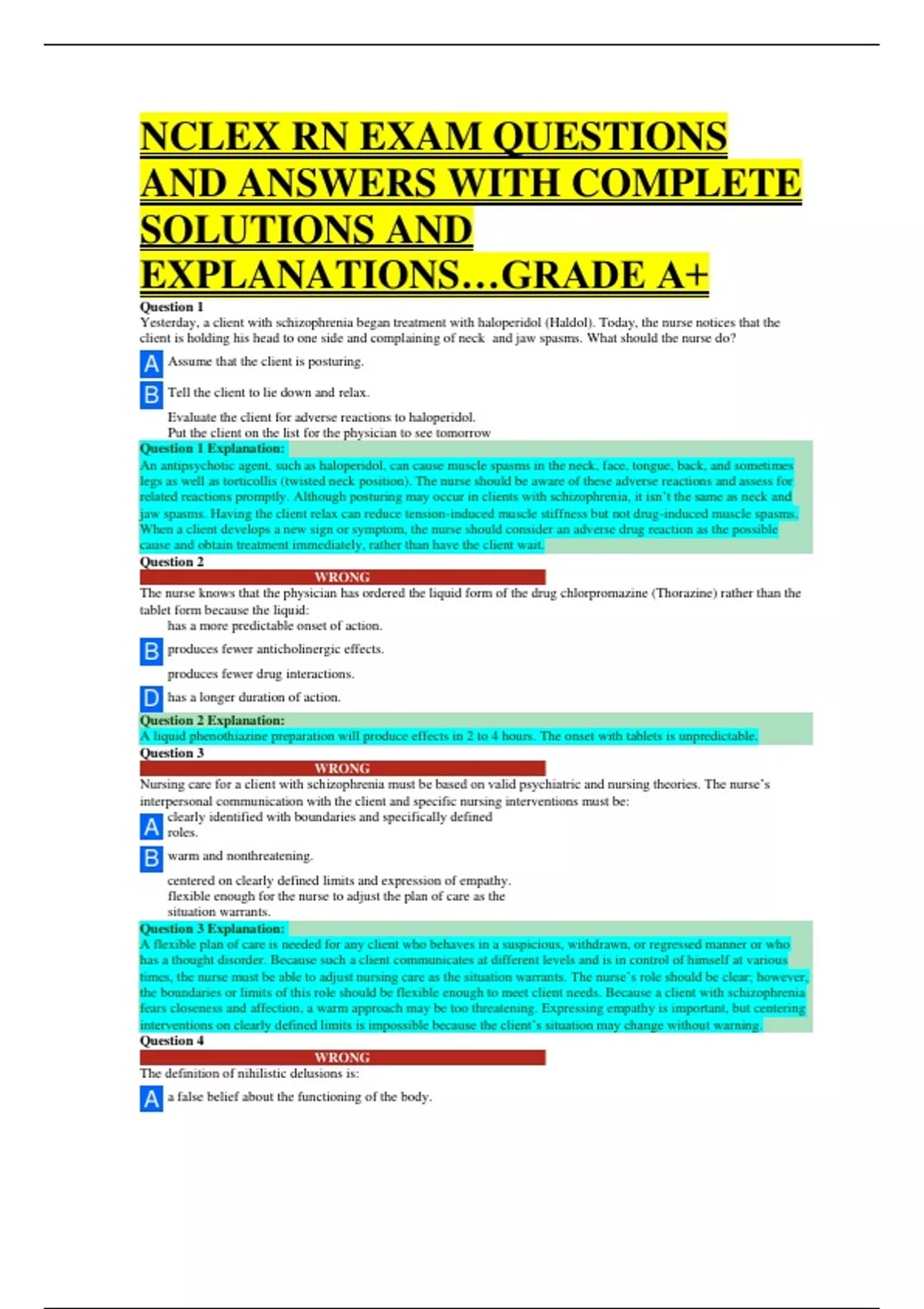 NCLEX RN EXAM QUESTIONS AND ANSWERS WITH COMPLETE SOLUTIONS AND EXPLANATIONS…GRADE A+ Question 1 Yesterday, a client with schizophrenia began treatment with haloperidol (Haldol). Today, the nurse notices that the client is holding his head to one side and complaining of neck and jaw spasms. What should the nurse do? A Assume that the client is posturing. B Tell the client to lie down and relax. Evaluate the client for adverse reactions to haloperidol. Put the client on the list for the physician to see tomorrow Question 1 Explanation: An antipsychotic agent, such as haloperidol, can cause muscle spasms in the neck, face, tongue, back, and sometimes legs as well as torticollis (twisted neck position). The nurse should be aware of these adverse reactions and assess for related reactions promptly. Although posturing may occur in clients with schizophrenia, it isn’t the same as neck and jaw spasms. Having the client relax can reduce tension-induced muscle stiffness but not drug-induced muscle spasms. When a client develops a new sign or symptom, the nurse should consider an adverse drug reaction as the possible cause and obtain treatment immediately, rather than have the client wait. Question 2 WRONG The nurse knows that the physician has ordered the liquid form of the drug chlorpromazine (Thorazine) rather than the tablet form because the liquid: has a more predictable onset of action. B produces fewer anticholinergic effects. produces fewer drug interactions. D has a longer duration of action. Question 2 Explanation: A liquid phenothiazine preparation will produce effects in 2 to 4 hours. The onset with tablets is unpredictable. Question 3 WRONG Nursing care for a client with schizophrenia must be based on valid psychiatric and nursing theories. The nurse’s interpersonal communication with the client and specific nursing interventions must be: A clearly identified with boundaries and specifically defined roles. B warm and nonthreatening. centered on clearly defined limits and expression of empathy. flexible enough for the nurse to adjust the plan of care as the situation warrants. Question 3 Explanation: A flexible plan of care is needed for any client who behaves in a suspicious, withdrawn, or regressed manner or who has a thought disorder. Because such a client communicates at different levels and is in control of himself at various times, the nurse must be able to adjust nursing care as the situation warrants. The nurse’s role should be clear; however, the boundaries or limits of this role should be flexible enough to meet client needs. Because a client with schizophrenia fears closeness and affection, a warm approach may be too threatening. Expressing empathy is important, but centering interventions on clearly defined limits is impossible because the client’s situation may change without warning. Question 4 WRONG The definition of nihilistic delusions is: A a false belief about the functioning of the body