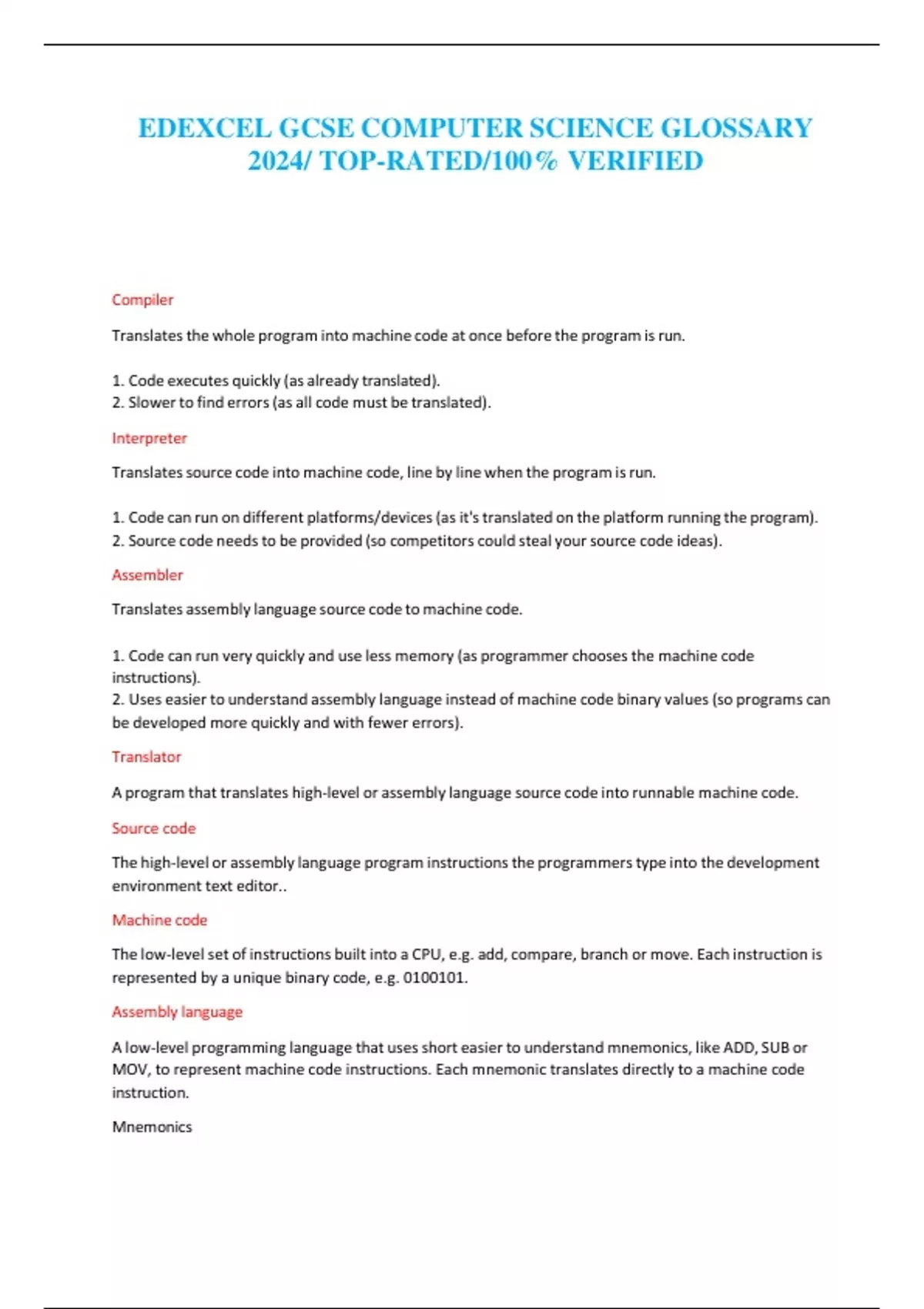 EDEXCEL GCSE COMPUTER SCIENCE GLOSSARY 2024/ TOP-RATED/100% VERIFIED