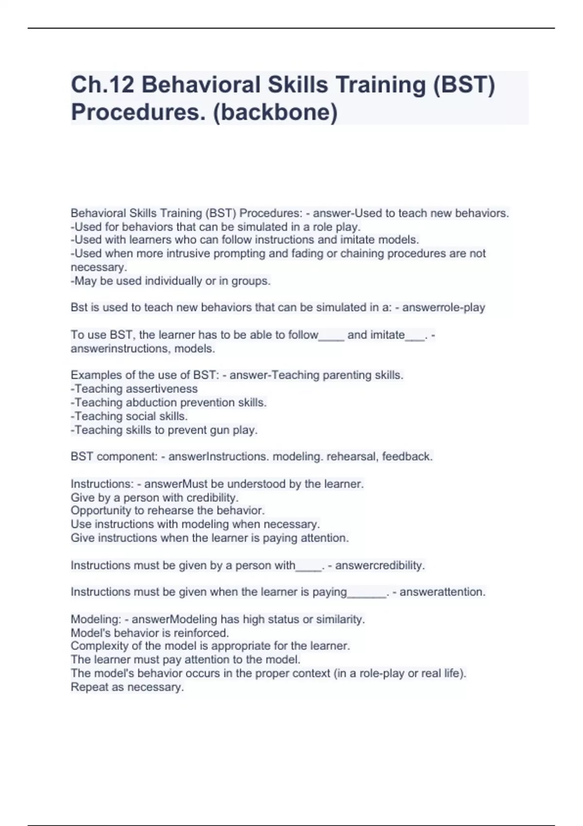 Ch.12 Behavioral Skills Training (BST) Procedures. (backbone) Questions and Answers 2024