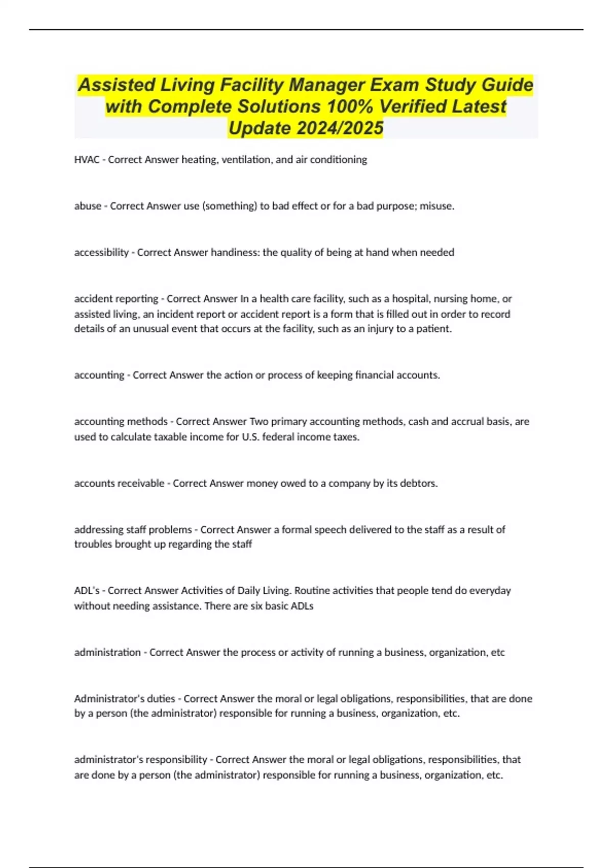 Assisted Living Facility Manager Exam Study Guide with Complete Solutions 100% Verified Latest Update 2024/2025 HVAC - Correct Answer heating, ventilation, and air conditioning abuse - Correct Answer use (something) to bad effect or for a bad purpose; misuse. accessibility - Correct Answer handiness: the quality of being at hand when needed accident reporting - Correct Answer In a health care facility, such as a hospital, nursing home, or assisted living, an incident report or accident report is a form that is filled out in order to record details of an unusual event that occurs at the facility, such as an injury to a patient. accounting - Correct Answer the action or process of keeping financial accounts. accounting methods - Correct Answer Two primary accounting methods, cash and accrual basis, are used to calculate taxable income for U.S. federal income taxes. accounts receivable - Correct Answer money owed to a company by its debtors. addressing staff problems - Correct Answer a formal speech delivered to the staff as a result of troubles brought up regarding the staff ADL's - Correct Answer Activities of Daily Living. Routine activities that people tend do everyday without needing assistance. There are six basic ADLs administration - Correct Answer the process or activity of running a business, organization, etc Administrator's duties - Correct Answer the moral or legal obligations, responsibilities, that are done by a person (the administrator) responsible for running a business, organization, etc. administrator's responsibility - Correct Answer the moral or legal obligations, responsibilities, that ar