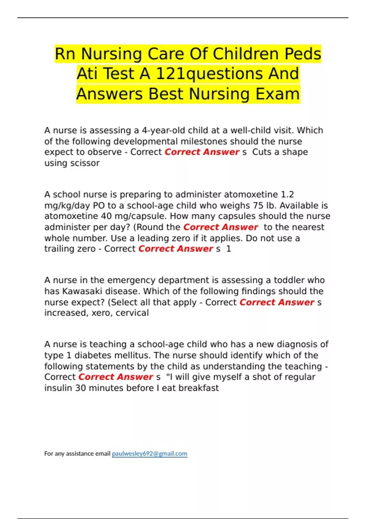 Rn Nursing Care Of Children Peds Ati Test A 121questions And Answers Best Nursing Exam