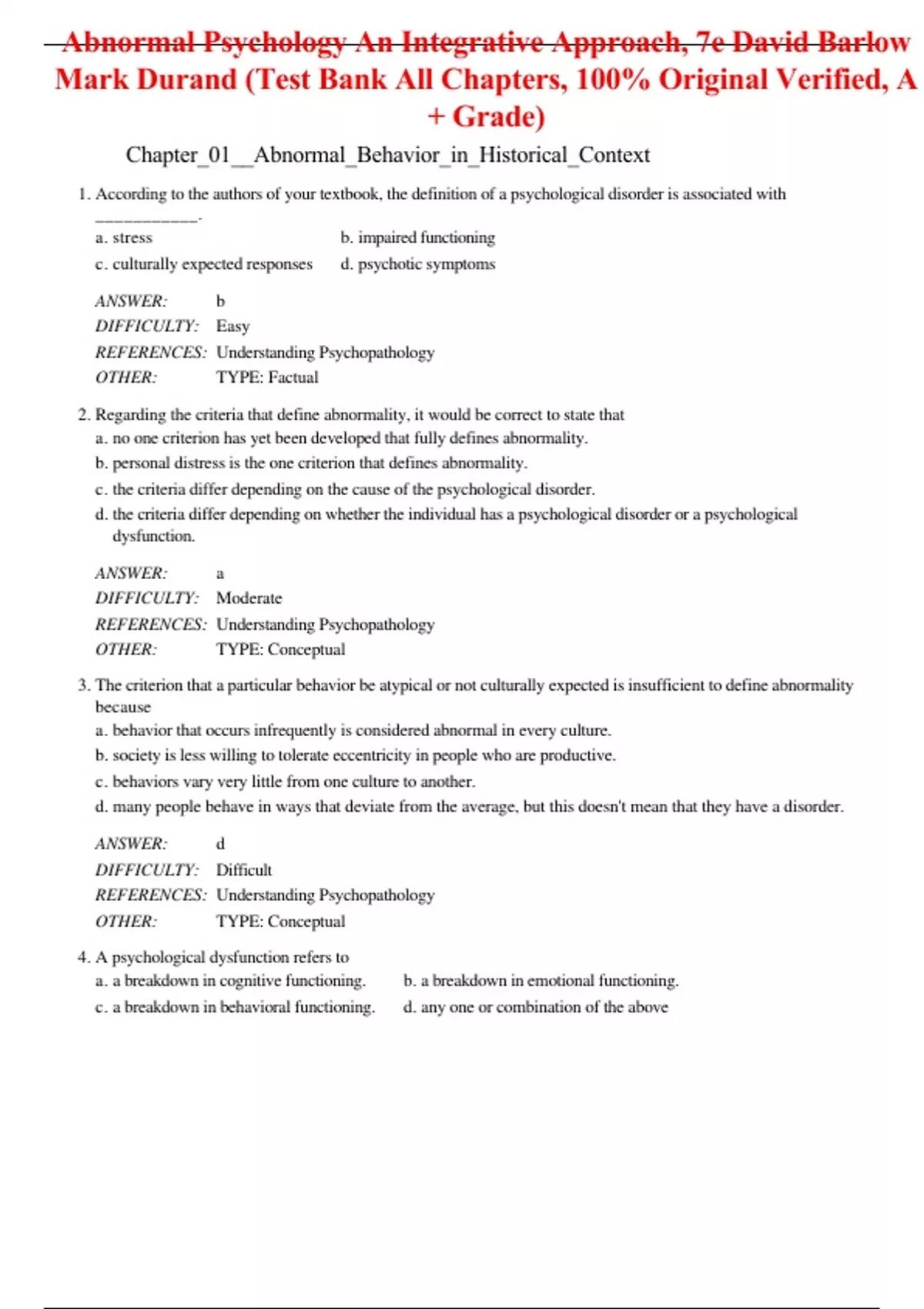 This Is Original 7th Edition of Test Bank From Original Author. All Other Files in the market are fake/old Edition. Other Sellers Have changed old Edition Number to new But Test Bank is old Edition. Test Bank for Abnormal Psychology An Integrative Approach 7th Edition By David Barlow, Mark Durand (All Chapters, 100% Original Verified, A+ Grade) Test Bank for Abnormal Psychology An Integrative Approach 7e By David Barlow, Mark Durand (All Chapters, 100% Original Verified, A+ Grade)