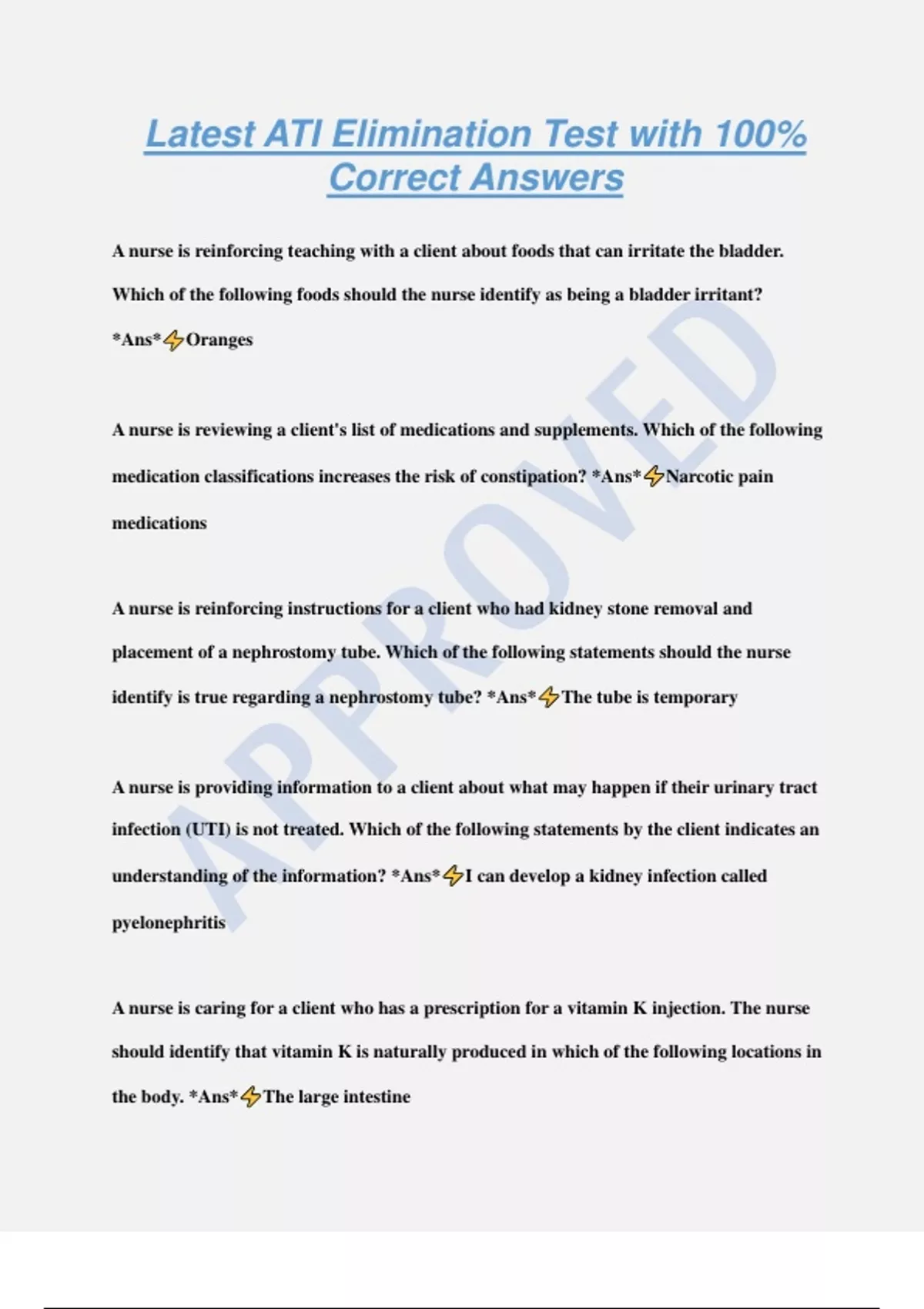 Latest ATI Elimination Test with 100% Correct Answers A nurse is reinforcing teaching with a client about foods that can irritate the bladder. Which of the following foods should the nurse identify as being a bladder irritant? *Ans* Oranges A nurse is reviewing a client's list of medications and supplements. Which of the following medication classifications increases the risk of constipation? *Ans* Narcotic pain medications A nurse is reinforcing instructions for a client who had kidney stone removal and placement of a nephrostomy tube. Which of the following statements should the nurse identify is true regarding a nephrostomy tube? *Ans* The tube is temporary A nurse is providing information to a client about what may happen if their urinary tract infection (UTI) is not treated. Which of the following statements by the client indicates an understanding of the information? *Ans* I can develop a kidney infection called pyelonephritis A nurse is caring for a client who has a prescription for a vitamin K injection. The nurse should identify that vitamin K is naturally produced in which of the following locations in the body. *Ans* The large intestine A nurse is caring for a group of client who are at risk for an alteration in urinary elimination. Which of the following groups should the nurse identify as being at an increased risk? (Select all the apply) Uncircumcised infants School-age children Middle adults Older adults Young adults *Ans* Uncircumcised infants School-age children Older adults A nurse is caring for an older adult client who is experiencing urinary leakage. Which of the following is an expected age-related change that can contribute to this occurrence? *Ans* Loss of bladder tone