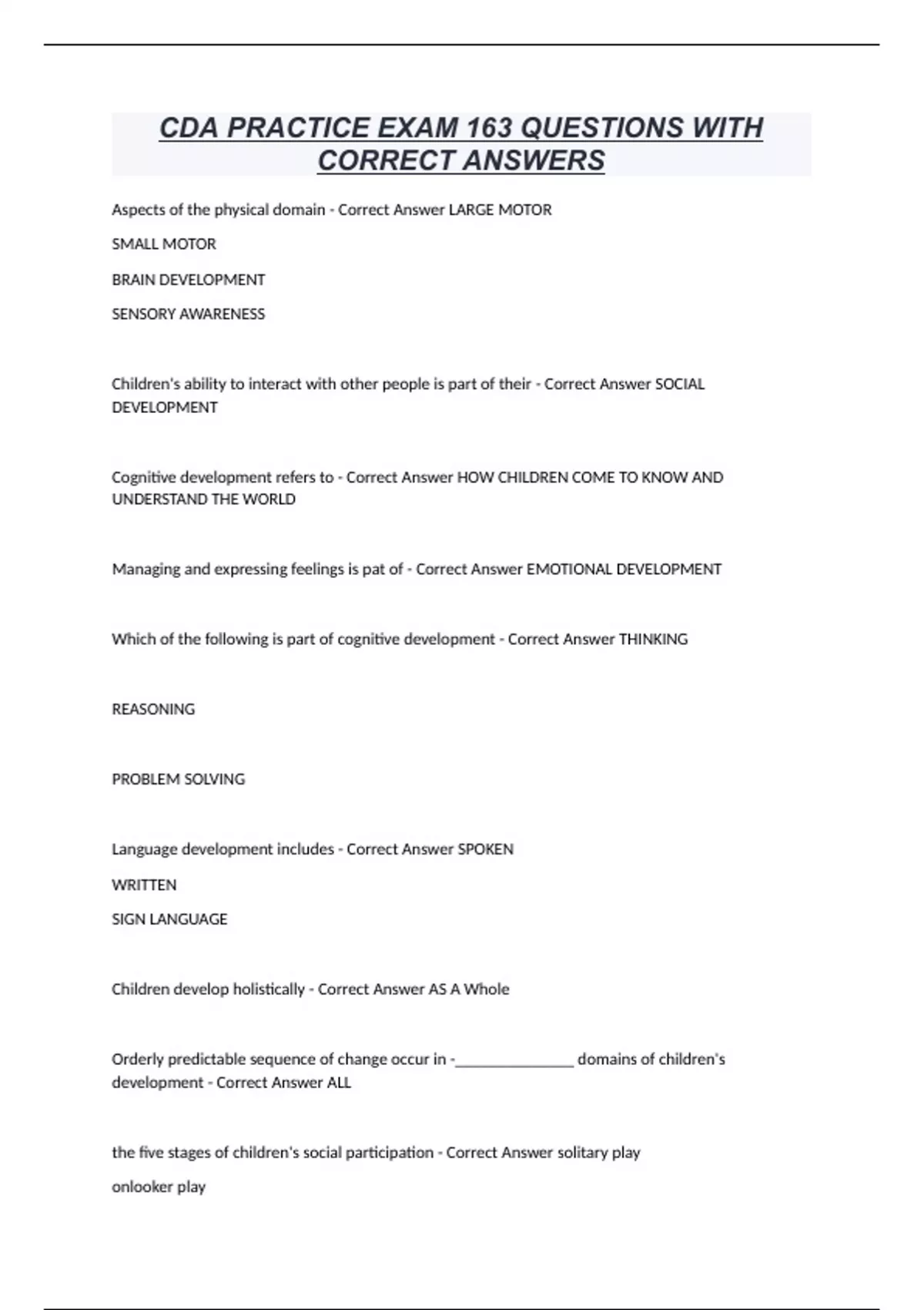 CDA PRACTICE EXAM 163 QUESTIONS WITH CORRECT ANSWERS Aspects of the physical domain - Correct Answer LARGE MOTOR SMALL MOTOR BRAIN DEVELOPMENT SENSORY AWARENESS Children's ability to interact with other people is part of their - Correct Answer SOCIAL DEVELOPMENT Cognitive development refers to - Correct Answer HOW CHILDREN COME TO KNOW AND UNDERSTAND THE WORLD Managing and expressing feelings is pat of - Correct Answer EMOTIONAL DEVELOPMENT Which of the following is part of cognitive development - Correct Answer THINKING REASONING PROBLEM SOLVING Language development includes - Correct Answer SPOKEN WRITTEN SIGN LANGUAGE Children develop holistically - Correct Answer AS A Whole Orderly predictable sequence of change occur in -______________ domains of children's development - Correct Answer ALL the five stages of children's social participation - Correct Answer solitary play onlooker play parallel play associative play cooperative play all children - Correct Answer FOLLOW THE SAME SEQUENCE BUT PROCEED AT THEIR OWN RATE