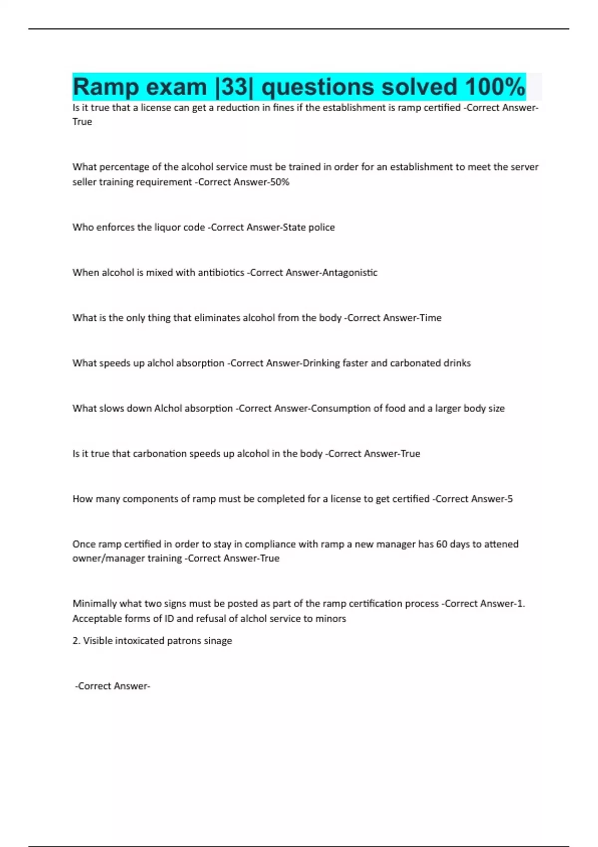Ramp exam |33| questions solved 100% Is it true that a license can get a reduction in fines if the establishment is ramp certified -Correct Answer-True What percentage of the alcohol service must be trained in order for an establishment to meet the server seller training requirement -Correct Answer-50% Who enforces the liquor code -Correct Answer-State police When alcohol is mixed with antibiotics -Correct Answer-Antagonistic What is the only thing that eliminates alcohol from the body -Correct Answer-Time What speeds up alchol absorption -Correct Answer-Drinking faster and carbonated drinks What slows down Alchol absorption -Correct Answer-Consumption of food and a larger body size Is it true that carbonation speeds up alcohol in the body -Correct Answer-True How many components of ramp must be completed for a license to get certified -Correct Answer-5 Once ramp certified in order to stay in compliance with ramp a new manager has 60 days to attened owner/manager training -Correct Answer-True Minimally what two signs must be posted as part of the ramp certification process -Correct Answer-1. Acceptable forms of ID and refusal of alchol service to minors 2. Visible intoxicated patrons sinage -Correct Answer-