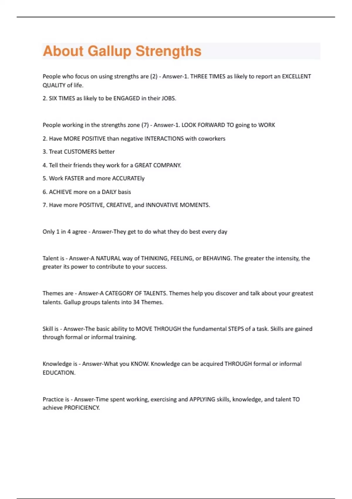 People who focus on using strengths are (2) - Answer-1. THREE TIMES as likely to report an EXCELLENT QUALITY of life. 2. SIX TIMES as likely to be ENGAGED in their JOBS. People working in the strengths zone (7) - Answer-1. LOOK FORWARD TO going to WORK 2. Have MORE POSITIVE than negative INTERACTIONS with coworkers 3. Treat CUSTOMERS better 4. Tell their friends they work for a GREAT COMPANY. 5. Work FASTER and more ACCURATEly 6. ACHIEVE more on a DAILY basis 7. Have more POSITIVE, CREATIVE, and INNOVATIVE MOMENTS. Only 1 in 4 agree - Answer-They get to do what they do best every day Talent is - Answer-A NATURAL way of THINKING, FEELING, or BEHAVING. The greater the intensity, the greater its power to contribute to your success. Themes are - Answer-A CATEGORY OF TALENTS. Themes help you discover and talk about your greatest talents. Gallup groups talents into 34 Themes. Skill is - Answer-The basic ability to MOVE THROUGH the fundamental STEPS of a task. Skills are gained through formal or informal training. Knowledge is - Answer-What you KNOW. Knowledge can be acquired THROUGH formal or informal EDUCATION. Practice is - Answer-Time spent working, exercising and APPLYING skills, knowledge, and talent TO achieve PROFICIENCY.Strength is - Answer-1. The ability to consistently produce a POSITIVE OUTCOME through NEAR-PERFECT PERFORMANCE in a specific task. 2. To finish with strength, start with talent. 3. Building talents into strengths requires practice and hard work. Strength fingerprint - Answer-The odds someone has the SAME 5 Themes in the same order is 1 in 33 MILLION. Guiding Principles (5) - Answer-1. Themes are NEUTRAL- depends on whether themes are productively applied. 2. Themes are NOT LABELS - rather they are tools to appreciate humanity's complexity. 3. Lead with POSITIVE INTENT - Understanding themes helps to see others positively. 4. DIFFERENCES are an ADVANTAGE - not problems, but resources. 5. People NEED ONE ANOTHER - there really is no such thing as a well-rounded person. Doing it all may be easier, but the quality is likely to be lower. Don Clifton quote - Answer-"What will happen when we think about what is RIGHT with people rather than fixating on what is WRONG with them?" How many have taken the Strengths assessment - Answer-More than 14 million.