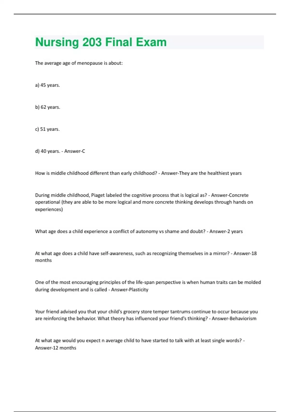 The average age of menopause is about: a) 45 years. b) 62 years. c) 51 years. d) 40 years. - Answer-C How is middle childhood different than early childhood? - Answer-They are the healthiest years During middle childhood, Piaget labeled the cognitive process that is logical as? - Answer-Concrete operational (they are able to be more logical and more concrete thinking develops through hands on experiences) What age does a child experience a conflict of autonomy vs shame and doubt? - Answer-2 years At what age does a child have self-awareness, such as recognizing themselves in a mirror? - Answer-18 months One of the most encouraging principles of the life-span perspective is when human traits can be molded during development and is called - Answer-Plasticity Your friend advised you that your child's grocery store temper tantrums continue to occur because you are reinforcing the behavior. What theory has influenced your friend's thinking? - Answer-Behaviorism At what age would you expect n average child to have started to talk with at least single words? - Answer-12 monthsAt what age do children run, jump, and tie their shoes? - Answer-6 years What age would Erikson say a person experiences development al crisis called industry vs inferiority - Answer-6-11 years What age would Erikson say a person experiences developmental crisis called identity vs role confusion - Answer-Teenage Years What kind of parenting style has been identified as supporting family function in the most positive way for the growth and development of the children in a family? - Answer-Authoritative Type of parenting where they would say, "I am the boss, don't talk back" and lack communication with their children? - Answer-Authoritarian Parenting style where the parent wants to be friends with their children and are very flexible - AnswerPermissive Jim is in his 60s and has started experiencing a gradual decline in his physical health. This is referred to as - Answer-Senescence Loretta has presbycusis. To compensate for this condition, she should probably consider: - AnswerGetting a hearing aide What part of the brain has to do with planning and impulsivity? - Answer-Pre-frontal cortex ? - Answer-Selective optimization Katie's 9-month-old son Jason sucks and chews on just about everything he finds—toys, books, fingers, and so forth. According to psychoanalytic theory, Jason is in the - Answer-Oral StageRachel is a young child who has been given a vaccination each time she has been to the doctor's office. She now starts to scream and cry each time she sees the doctor's office building. According to the principles of classical conditioning, she is screaming and crying because she: a) has learned to associate the building with the pain she feels when she gets a shot. b) is angry at the doctor and her mother for giving her shots. c) is trying to discourage her parents from taking her to the doctor. d)mistrusts her parents and the doctor - Answer-A (Has learned to associate the building with the pain she feels when she gets a shot) Social learning theory emphasizes learning through: A) Cooperation with others B) Observation and imitation C) Understanding how one's behavior affects other people. D) Reinforces - Answer-B (Observation and imitation)