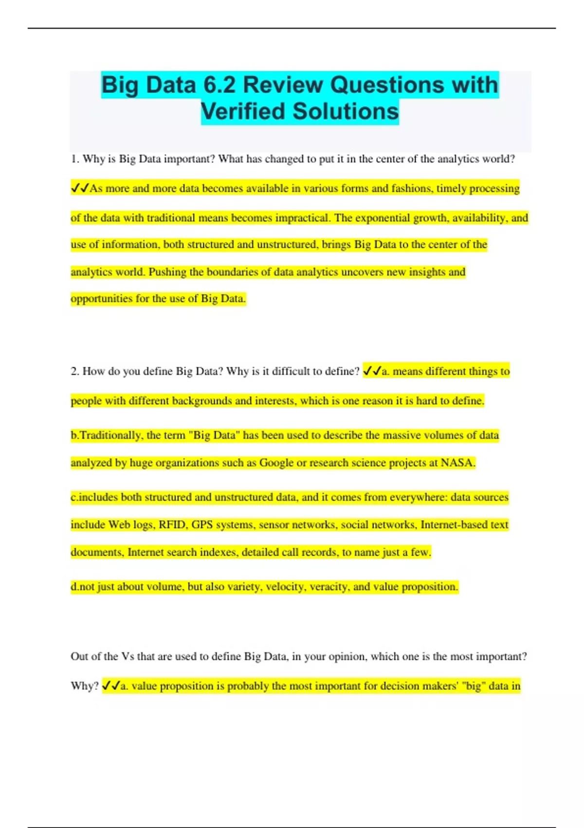 Big Data 6.2 Review Questions with Verified Solutions 1. Why is Big Data important? What has changed to put it in the center of the analytics world? As more and more data becomes available in various forms and fashions, timely processing of the data with traditional means becomes impractical. The exponential growth, availability, and use of information, both structured and unstructured, brings Big Data to the center of the analytics world. Pushing the boundaries of data analytics uncovers new insights and opportunities for the use of Big Data. 2. How do you define Big Data? Why is it difficult to define? a. means different things to people with different backgrounds and interests, which is one reason it is hard to define. b.Traditionally, the term "Big Data" has been used to describe the massive volumes of data analyzed by huge organizations such as Google or research science projects at NASA. des both structured and unstructured data, and it comes from everywhere: data sources include Web logs, RFID, GPS systems, sensor networks, social networks, Internet-based text documents, Internet search indexes, detailed call records, to name just a few. just about volume, but also variety, velocity, veracity, and value proposition. Out of the Vs that are used to define Big Data, in your opinion, which one is the most important? Why? a. value proposition is probably the most important for decision makers' "big" data in that it contains (or has a greater potential to contain) more patterns and interesting anomalies than "small" data. b. by analyzing large and feature rich data, organizations can gain greater business value that they may not have otherwise. While users can detect the patterns in small data sets using simple statistical and machine-learning methods or ad hoc query and reporting tools, c. Big Data means "big" analytics. Big analytics means greater insight and better decisions, something that every organization needs nowadays. What do you think the future of Big Data will be like? Will it lose its popularity to something else? If so, what will it be? a. Big Data could evolve at a rapid pace. b. The buzzword "Big Data" might change to something else, but the trend toward increased computing capabilities, analytics methodologies, and data management of high volume heterogeneous information will continue.