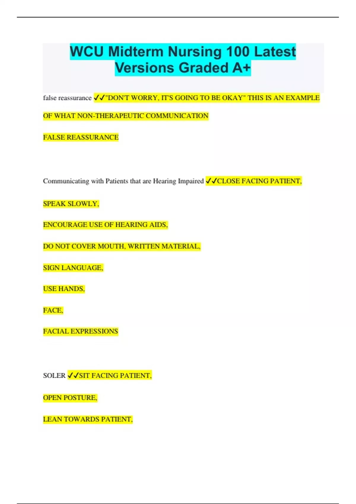 WCU Midterm Nursing 100 Latest Versions Graded A+ false reassurance "DON'T WORRY, IT'S GOING TO BE OKAY" THIS IS AN EXAMPLE OF WHAT NON-THERAPEUTIC COMMUNICATION FALSE REASSURANCE Communicating with Patients that are Hearing Impaired CLOSE FACING PATIENT, SPEAK SLOWLY, ENCOURAGE USE OF HEARING AIDS, DO NOT COVER MOUTH, WRITTEN MATERIAL, SIGN LANGUAGE, USE HANDS, FACE, FACIAL EXPRESSIONS SOLER SIT FACING PATIENT, OPEN POSTURE, LEAN TOWARDS PATIENT, EYE CONTACT, RELAX "DO'S" OF COMMUNICATION (5) SILENCE, PRESENTING REALITY, ACTIVE LISTENING, ASKING QUESTIONS, OPEN-ENDED QUESTIONS, CLARIFYING TECHNIQUES, OFFERING GENERAL LEADS/BROAD STATEMENTS, SHOWING ACCEPTANCE AND RECOGNITION, FOCUSING, GIVING INFORMATION, SUMMARIZING, OFFERING SELF, TOUCH, SET BOUNDARIES/LIMITS WHEN NEEDED "ISBAR" MEANING AND EXAMPLE OF EACH INTRODUCE, SITUATION, BACKGROUND, ASSESSMENT, RECOMMENDATION MOST IMPORTANT IN REDUCING SPREAD OF INFECTION "HANDWASHING" CDIFF PRECAUTIONS STANDARD PLUS WASH HANDS WITH SOAP AND WATER CLEAN EQUIPMENT WITH BLEACH ONLY DIFFERENCE BETWEEN MEDICAL AND SURGICAL ASEPSIS MEDICAL: "CLEAN TECHNIQUE", REDUCE NUMBER OF MICROORGANISMS. SURGICAL: "STERILE TECHNIQUE", ELIMINATE NUMBER OF MICROORGANISMS. LABS AND DIAGNOSTICS FOR DIAGNOSING INFECTION (4) WBC, ESR, C&S, CXR, CT, MRI