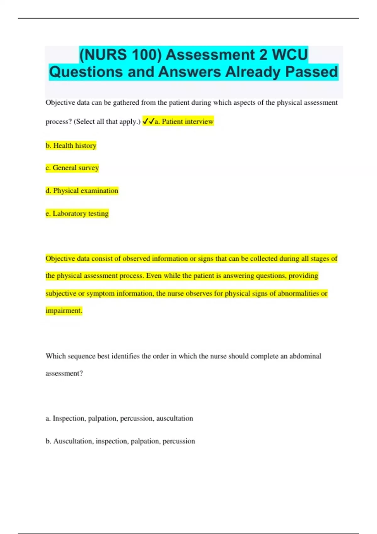 (NURS 100) Assessment 2 WCU Questions and Answers Already Passed Objective data can be gathered from the patient during which aspects of the physical assessment process? (Select all that apply.) a. Patient interview b. Health history c. General survey d. Physical examination e. Laboratory testing Objective data consist of observed information or signs that can be collected during all stages of the physical assessment process. Even while the patient is answering questions, providing subjective or symptom information, the nurse observes for physical signs of abnormalities or impairment. Which sequence best identifies the order in which the nurse should complete an abdominal assessment? a. Inspection, palpation, percussion, auscultation b. Auscultation, inspection, palpation, percussion c. Auscultation, palpation, percussion, inspection d. Inspection, auscultation, percussion, palpation d. Inspection, auscultation, percussion, palpation Assessment of the abdominal cavity requires inspection then auscultation, percussion then palpation to avoid stimulating the bowel and eliciting inaccurate assessment results. A nurse is preparing to auscultate a patient's chest. In which area should the nurse listen to evaluate the patient's aortic valve? a. Second right intercostal space b. Third left intercostal space c. Fifth right intercostal space d. Fifth left intercostal space along the midclavicular line a. Second right intercostal space The second intercostal space on the right is the auscultation point for the aortic valve. The ventricles and pulmonic valve are located on the left. The point of maximal impulse (PMI) over the mitral valve is located between the left fourth and fifth intercostal spaces. The nurse notes the presence of ptosis when assessing an adult patient's eyes. Which potential cause would be considered of most concern, requiring further evaluation as soon as possible? a. Loss of skin elasticity b. Levator muscle weakness c. Congenital ocular abnormality d. Oculomotor cranial nerve III paralysis d. Oculomotor cranial nerve III paralysis Oculomotor paralysis may indicate the presence of a larger neurologic problem that requires further investigation as soon as possible. Loss of skin elasticity and muscle weakness may be due to aging, and congenital ptosis does not require immediate attention in an adult. Which type of lung sounds does the nurse expect to auscultate over most of the lung fields? a. Vesicular b. Resonant c. Dull d. Flat a. Vesicular Vesicular breathe sound are heard over most of the lung fields. Resonance is heard with percussion, not auscultation. Dullness is heard over the solid organs (liver, heart). Flat sounds are heard over the stomach and intestines. When teaching a patient about fire safety, which activity does the nurse know is the leading cause of fire-related death? a. Cooking b. Playing with matches c. Smoking d. Heating with kerosene heaters a. Cooking Cooking I the leading cause of residential fires for the last decade, followed by heating, electrical malfunction. And other unintentional causes or carelessness. Which measures can the nurse teach to prevent poisoning of children? (Select all that apply.) a. Install safety latches on reachable cabinets. b. Keep syrup of ipecac on hand.
