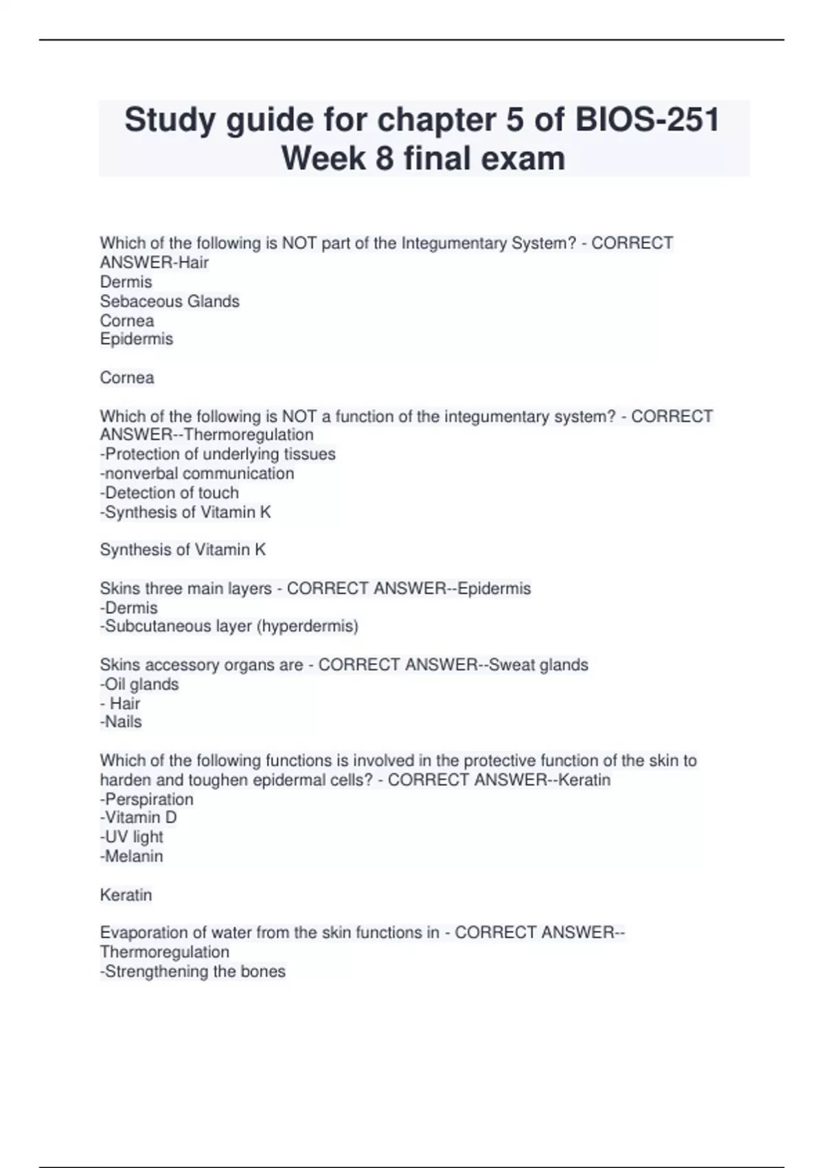 Study guide for chapter 5 of BIOS-251 Week 8 final exam Which of the following is NOT part of the Integumentary System? - CORRECT ANSWER-Hair Dermis Sebaceous Glands Cornea Epidermis Cornea Which of the following is NOT a function of the integumentary system? - CORRECT ANSWER--Thermoregulation -Protection of underlying tissues -nonverbal communication -Detection of touch -Synthesis of Vitamin K Synthesis of Vitamin K Skins three main layers - CORRECT ANSWER--Epidermis -Dermis -Subcutaneous layer (hyperdermis) Skins accessory organs are - CORRECT ANSWER--Sweat glands -Oil glands - Hair -Nails Which of the following functions is involved in the protective function of the skin to harden and toughen epidermal cells? - CORRECT ANSWER--Keratin -Perspiration -Vitamin D -UV light -Melanin Keratin Evaporation of water from the skin functions in - CORRECT ANSWER-- Thermoregulatio