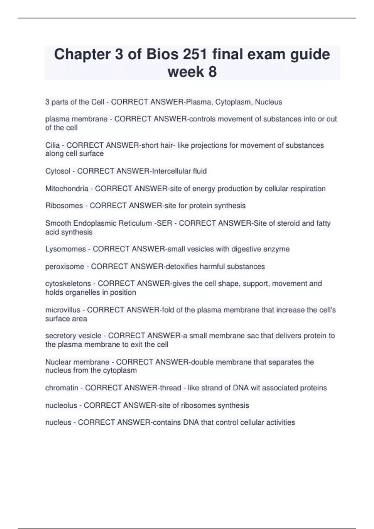 Chapter 3 of Bios 251 final exam guide week 8 3 parts of the Cell - CORRECT ANSWER-Plasma, Cytoplasm, Nucleus plasma membrane - CORRECT ANSWER-controls movement of substances into or out of the cell Cilia - CORRECT ANSWER-short hair- like projections for movement of substances along cell surface Cytosol - CORRECT ANSWER-Intercellular fluid Mitochondria - CORRECT ANSWER-site of energy production by cellular respiration Ribosomes - CORRECT ANSWER-site for protein synthesis Smooth Endoplasmic Re