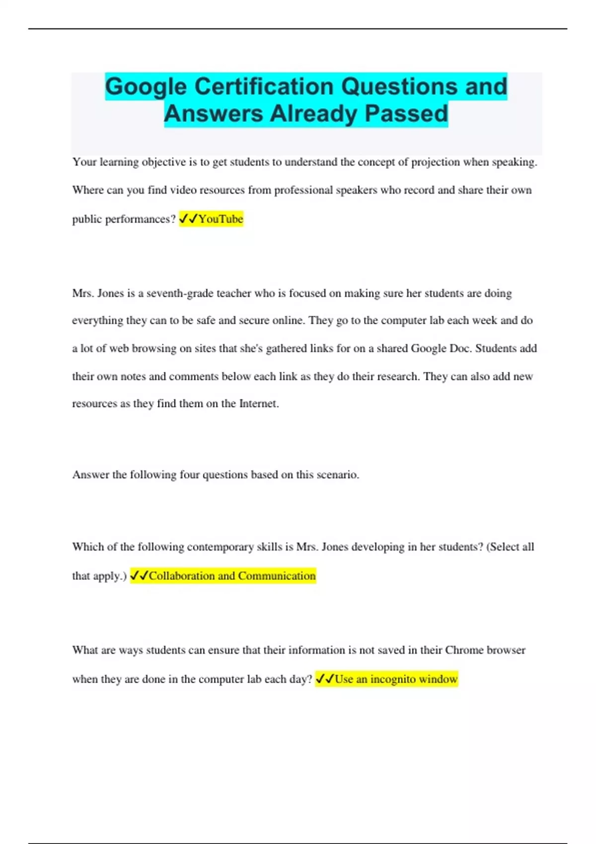 Google Certification Questions and Answers Already Passed Your learning objective is to get students to understand the concept of projection when speaking. Where can you find video resources from professional speakers who record and share their own public performances? YouTube Mrs. Jones is a seventh-grade teacher who is focused on making sure her students are doing everything they can to be safe and secure online. They go to the computer lab each week and do a lot of web browsing on sites that she's gathered links for on a shared Google Doc. Students add their own notes and comments below each link as they do their research. They can also add new resources as they find them on the Internet. Answer the following four questions based on this scenario. Which of the following contemporary skills is Mrs. Jones developing in her students? (Select all that apply.) Collaboration and Communication What are ways students can ensure that their information is not saved in their Chrome browser when they are done in the computer lab each day? Use an incognito window Clear the browsing history Which of the following tools are part of G Suite for Education, and thus covered by the G Suite for Education Terms of Service? Google Sites Google Drive When trying to select the right tool to integrate into your class, you should always start with: The learning goal Parents are looking for guidance on what to tell their children about being safe online. If you could give two simple tips that underlie everything, what would they be? Respect yourself and others Do everything you can to protect yourself What are some benefits of using online resources in curriculum? Updated content Content can be engaged with to extend learning Can be linked to related content Rather than just reading about a location in a textbook, a great tool to help visualize a location and consider its impact on history would be: Google Maps Which of the following online resources could you use when you want to search for how to do something with a Google tool? (Select all that apply.) Google Search Google Help Center Google for Education Help Forums