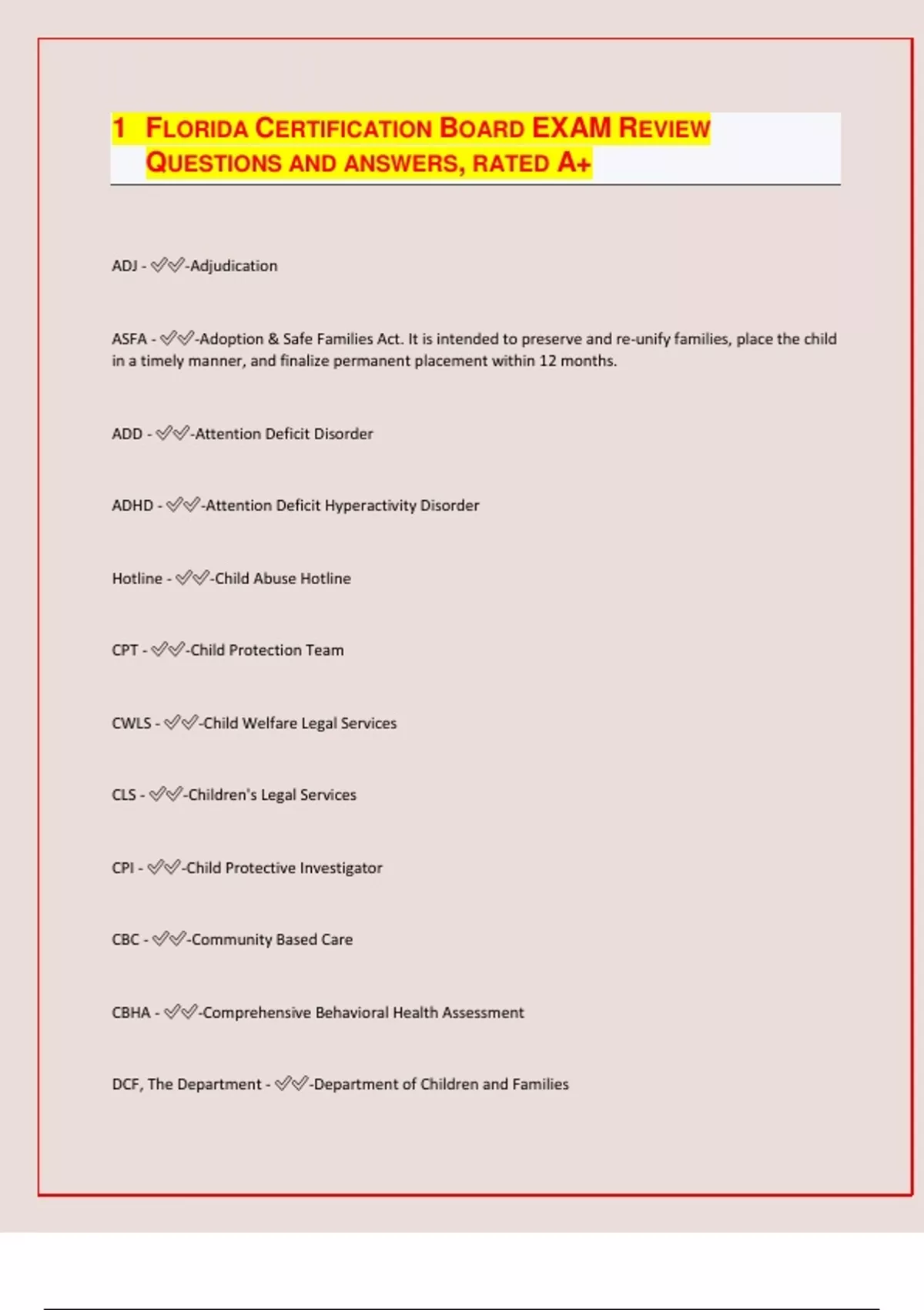 FLORIDA CERTIFICATION BOARD EXAM REVIEW QUESTIONS AND ANSWERS, RATED A+ ADJ - -Adjudication ASFA - -Adoption & Safe Families Act. It is intended to preserve and re-unify families, place the child in a timely manner, and finalize permanent placement within 12 months. ADD - -Attention Deficit Disorder ADHD - -Attention Deficit Hyperactivity Disorder Hotline - -Child Abuse Hotline CPT - -Child Protection Team CWLS - -Child Welfare Legal Services CLS - -Children's Legal Services CPI - -Child Protective Investigator CBC - -Community Based Care CBHA - -Comprehensive Behavioral Health Assessment DCF, The Department - -Department of Children and Families DJJ - -Department of juvenile justice Dispo - -Dispositional hearing DV - -Domestic Violence ESI - -Early Services Intervention ESS - -Economic Self-Sufficiency FAHIS - -Florida Abuse Hotline Information System FAC, Rule - -Florida Administrative Code FDLE - -Florida Department of Law Enforcement FSFN - -Florida Safe Families Network FS - -Florida Statute
