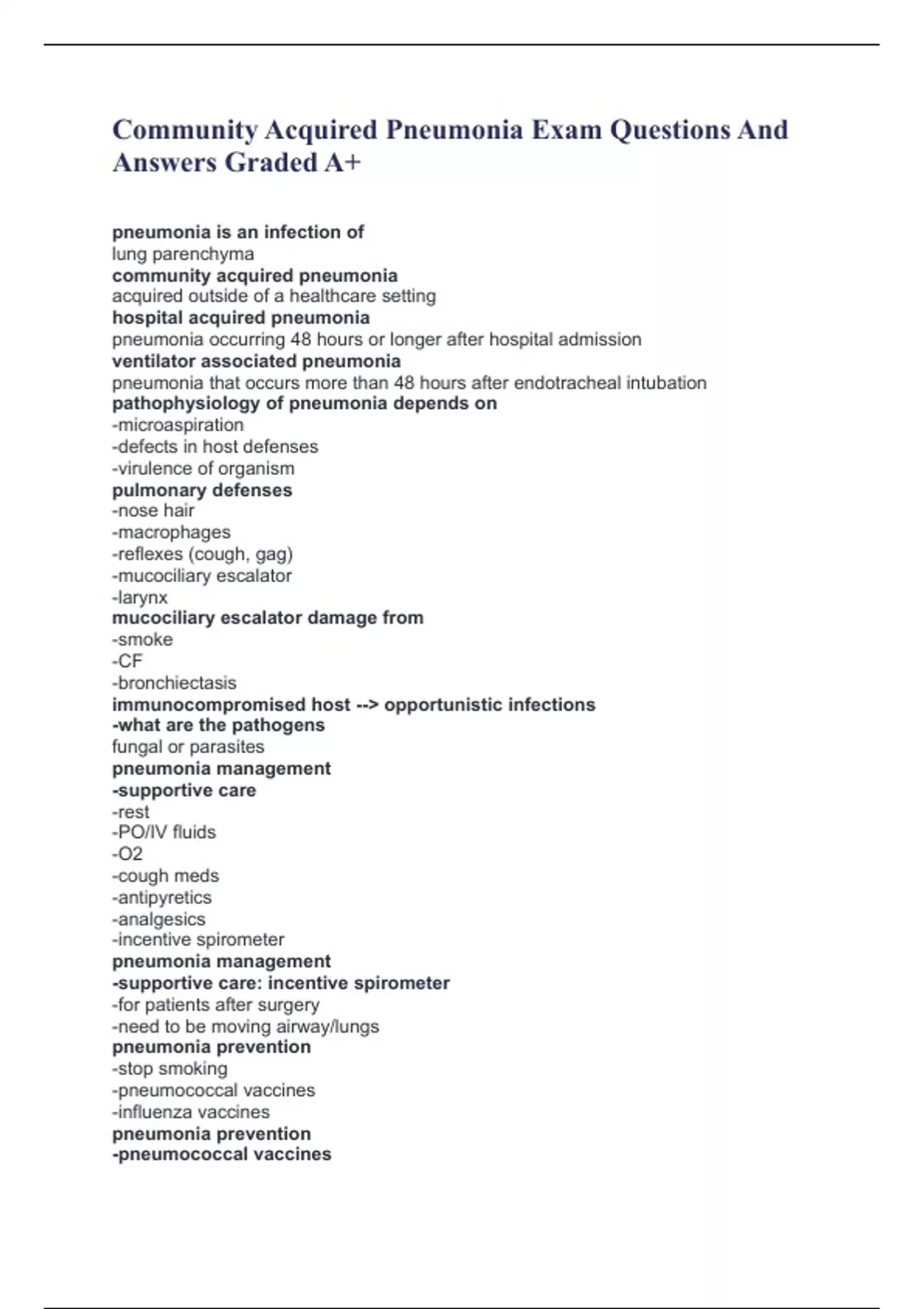 Community Acquired Pneumonia Exam Questions And Answers Graded A+ pneumonia is an infection of lung parenchyma community acquired pneumonia acquired outside of a healthcare setting hospital acquired pneumonia pneumonia occurring 48 hours or longer after hospital admission ventilator associated pneumonia pneumonia that occurs more than 48 hours after endotracheal intubation pathophysiology of pneumonia depends on -microaspiration -defects in host defenses -virulence of organism pulmonary defenses -nose hair -macrophages -reflexes (cough, gag) -mucociliary escalator -larynx mucociliary escalator damage from -smoke -CF -bronchiectasis immunocompromised host --> opportunistic infections -what are the pathogens fungal or parasites pneumonia management -supportive care -rest -PO/IV fluids -O2 -cough meds -antipyretics -analgesics -incentive spirometer pneumonia management -supportive care: incentive spirometer -for patients after surgery -need to be moving airway/lungs pneumonia prevention -stop smoking -pneumococcal vaccines -influenza vaccines pneumonia prevention -pneumococcal vaccines
