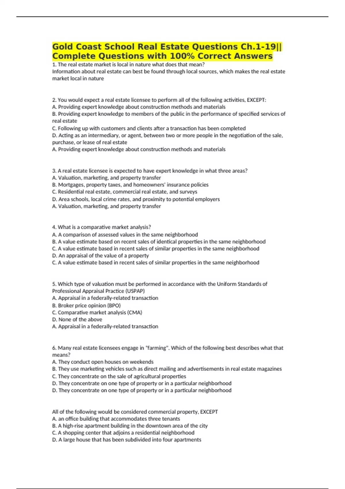 Gold Coast School Real Estate Questions Ch.1-19||Complete Questions with 100% Correct Answers 1. The real estate market is local in nature what does that mean? Information about real estate can best be found through local sources, which makes the real estate market local in nature 2. You would expect a real estate licensee to perform all of the following activities, EXCEPT: A. Providing expert knowledge about construction methods and materials B. Providing expert knowledge to members of the public in the performance of specified services of real estate C. Following up with customers and clients after a transaction has been completed D. Acting as an intermediary, or agent, between two or more people in the negotiation of the sale, purchase, or lease of real estate A. Providing expert knowledge about construction methods and materials 3. A real estate licensee is expected to have expert knowledge in what three areas? A. Valuation, marketing, and property transfer B. Mortgages, property taxes, and homeowners' insurance policies C. Residential real estate, commercial real estate, and surveys D. Area schools, local crime rates, and proximity to potential employers A. Valuation, marketing, and property transfer 4. What is a comparative market analysis? A. A comparison of assessed values in the same neighborhood B. A value estimate based on recent sales of identical properties in the same neighborhood C. A value estimate based in recent sales of similar properties in the same neighborhood D. An appraisal of the value of a property C. A value estimate based in recent sales of similar properties in the same neighborhood 5. Which type of valuation must be performed in accordance with the Uniform Standards of Professional Appraisal Practice (USPAP) A. Appraisal in a federally-related transaction B. Broker price opinion (BPO) C. Comparative market analysis (CMA) D. None of the above A. Appraisal in a federally-related transaction 6. Many real estate licensees engage in "farming". Which of the following best describes what that means? A. They conduct open houses on weekends B. They use marketing vehicles such as direct mailing and advertisements in real estate magazines C. They concentrate on the sale of agricultural properties D. They concentrate on one type of property or in a particular neighborhood D. They concentrate on one type of property or in a particular neighborhood All of the following would be considered commercial property, EXCEPT A. an office building that accommodates three tenants B. A high-rise apartment building in the downtown area of the city C. A shopping center that adjoins a residential neighborhood D. A large house that has been subdivided into four apartments D. A large house that has been subdivided into four apartments If the sale of a business involves the transfer of ownership of shares of stock, what additional requirement is imposed? A. The real estate licensee must be associated with a brokerage firm B. A brokerage firm must be brought in to handle the transaction C. The real estate licensee must have a securities license D. The real estate licensee must have experience as a stockbroker C. The real estate licensee must have a securities license Which real estate professional is expected to have the greatest level of knowledge and experience? a real estate counselor all of the following are responsibilities of a property manager, EXCEPT A. Handling the payment of taxes, insurance, and operating expenses for the property B. Evaluating the investment value of the property C. Locating tenants, collecting rents, maintaining records, and scheduling maintenance D. Protecting the owner's investment and maximizing the profitability of the investment B. Evaluating the investment value of the property According to F.S. 475, all of the following transactions are considered residential transactions, EXCEPT: A. A lease on a unit in a duplex, with an option to purchase the unit B. The sale of a 10-unit apartment building C. The sale of an eight-acre strawberry farm D. The sale of a lot that is zoned for a single-family home B. The sale of a 10-unit apartment building Which of the following best defines appraising? A. The process of determining the amount of equity in real property B. The process of establishing the asking price of real property C. The process of establishing the firm value of real property D. The process of developing an opinion of the value of real property D. The process of developing an opinion of the value of real property On what is an appraisal fee based? A. An average of the fees charged for appraisals of similar properties B. The time, effort, and expense involved in conducting the appraisal C. The value of the property D. The amount of time the appraiser spends, according to the prevailing hourly rate in the area B. The time, effort, and expense involved in conducting the appraisal Which statement about insurance is accurate? A. Most homeowner's insurance policies include home warranty coverage B. C. D. Ch.2