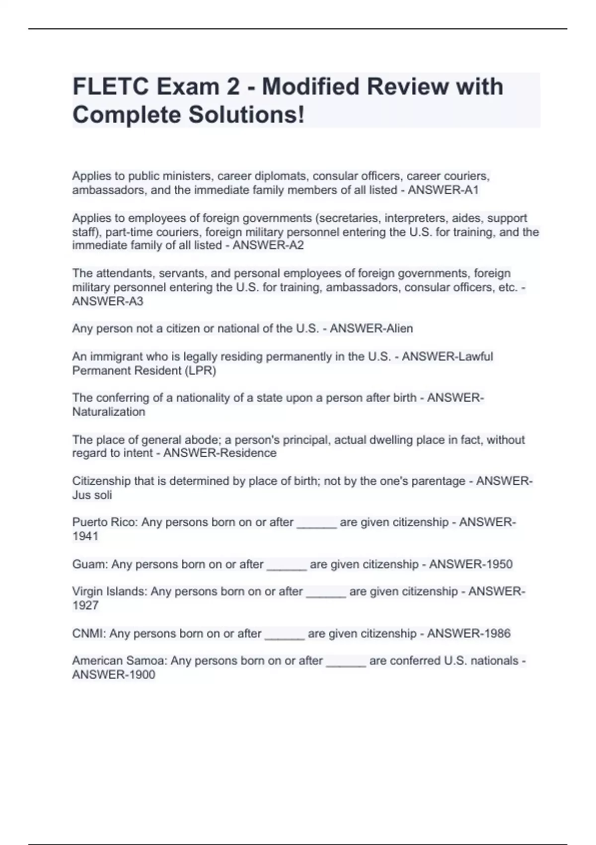 Applies to public ministers, career diplomats, consular officers, career couriers, ambassadors, and the immediate family members of all listed - ANSWER-A1 Applies to employees of foreign governments (secretaries, interpreters, aides, support staff), part-time couriers, foreign military personnel entering the U.S. for training, and the immediate family of all listed - ANSWER-A2 The attendants, servants, and personal employees of foreign governments, foreign military personnel entering the U.S. for training, ambassadors, consular officers, etc. - ANSWER-A3 Any person not a citizen or national of the U.S. - ANSWER-Alien An immigrant who is legally residing permanently in the U.S. - ANSWER-Lawful Permanent Resident (LPR) The conferring of a nationality of a state upon a person after birth - ANSWER-Naturalization The place of general abode; a person's principal, actual dwelling place in fact, without regard to intent - ANSWER-Residence Citizenship that is determined by place of birth; not by the one's parentage - ANSWER-Jus soli Puerto Rico: Any persons born on or after ______ are given citizenship - ANSWER-1941 Guam: Any persons born on or after ______ are given citizenship - ANSWER-1950 Virgin Islands: Any persons born on or after ______ are given citizenship - ANSWER-1927 CNMI: Any persons born on or after ______ are given citizenship - ANSWER-1986 American Samoa: Any persons born on or after ______ are conferred U.S. nationals - ANSWER-1900 Swains Island: Any persons born on or after ______ are conferred U.S. nationals - ANSWER-1925 What are the four exceptions to the jus soli principle? - ANSWER-1) Born on foreign