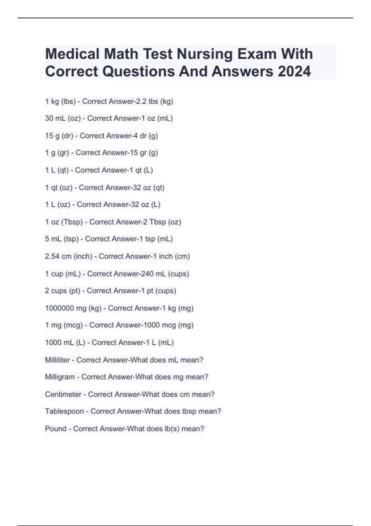 Medical Math Test Nursing Exam With Correct Questions And Answers 2024