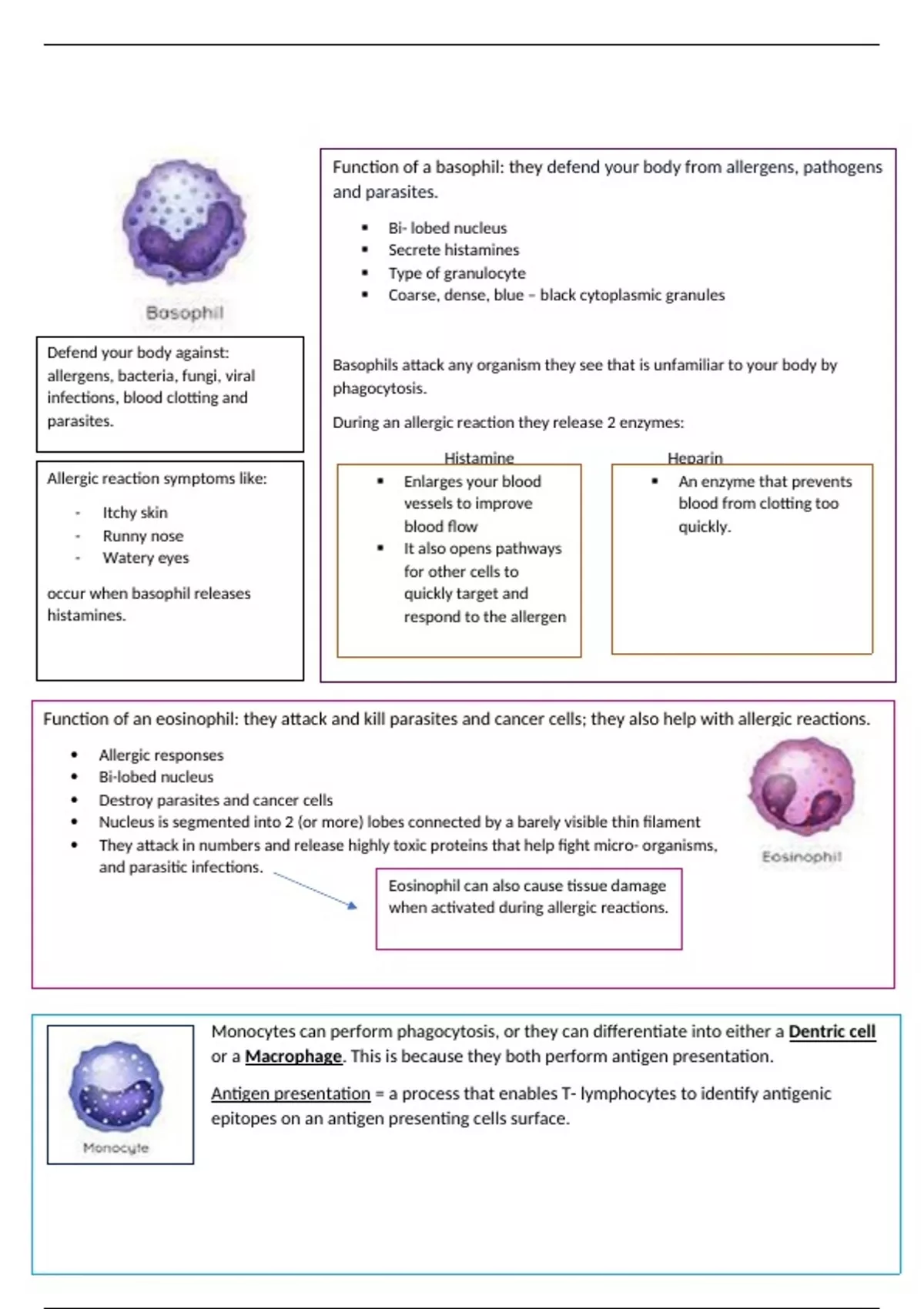 Function of an eosinophil: they attack and kill parasites and cancer cells; they also help with allergic reactions.