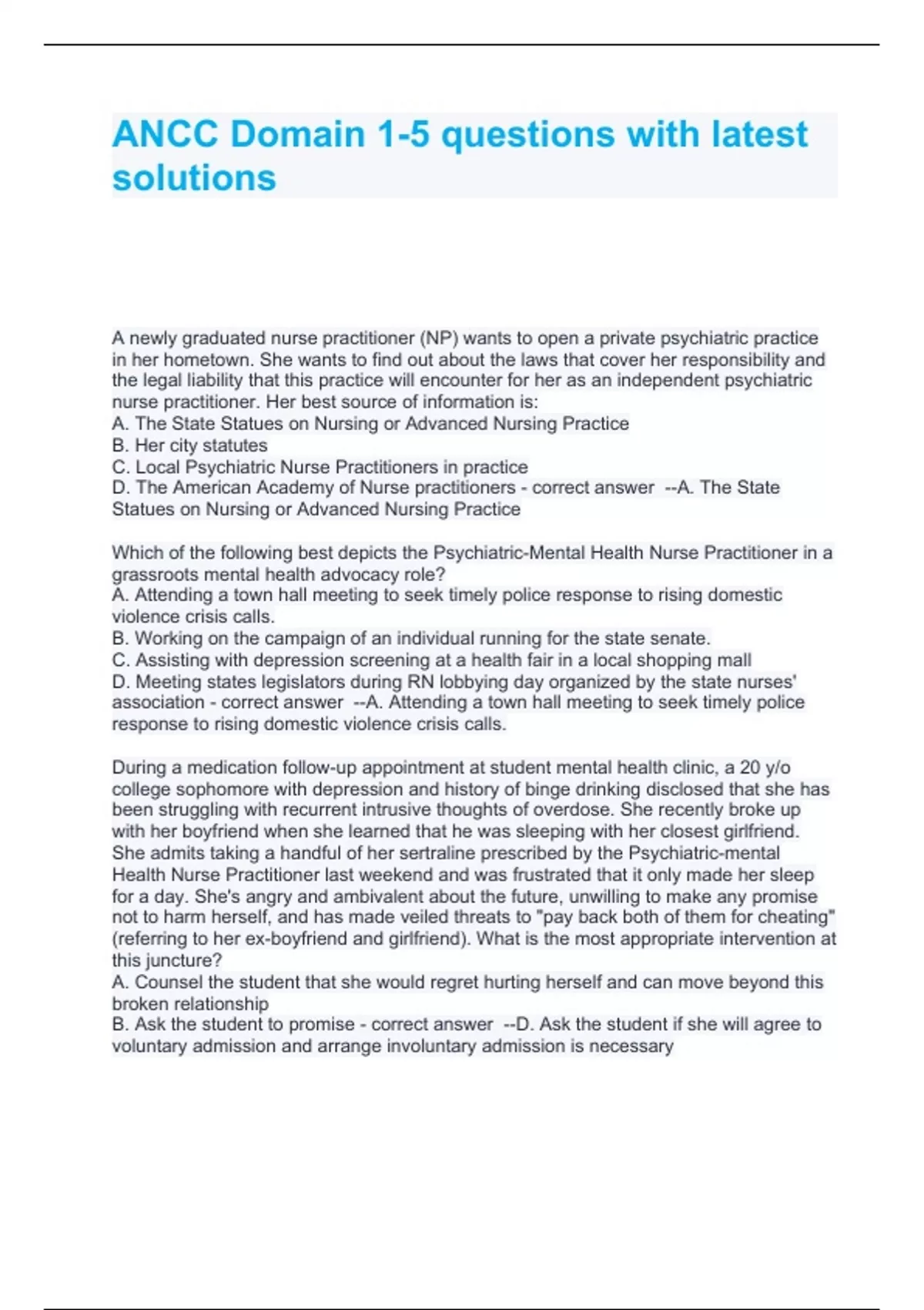 A newly graduated nurse practitioner (NP) wants to open a private psychiatric practice in her hometown. She wants to find out about the laws that cover her responsibility and the legal liability that this practice will encounter for her as an independent psychiatric nurse practitioner. Her best source of information is: A. The State Statues on Nursing or Advanced Nursing Practice B. Her city statutes C. Local Psychiatric Nurse Practitioners in practice D. The American Academy of Nurse practitioners - correct answer --A. The State Statues on Nursing or Advanced Nursing Practice Which of the following best depicts the Psychiatric-Mental Health Nurse Practitioner in a grassroots mental health advocacy role? A. Attending a town hall meeting to seek timely police response to rising domestic violence crisis calls. B. Working on the campaign of an individual running for the state senate. C. Assisting with depression screening at a health fair in a local shopping mall D. Meeting states legislators during RN lobbying day organized by the state nurses' association - correct answer --A. Attending a town hall meeting to seek timely police response to rising domestic violence crisis calls. During a medication follow-up appointment at student mental health clinic, a 20 y/o college sophomore with depression and history of binge drinking disclosed that she has been struggling with recurrent intrusive thoughts of overdose. She recently broke up with her boyfriend when she learned that he was sleeping with her closest girlfriend. She admits taking a handful of her sertraline prescribed by the Psychiatric-mental Health Nurse Practitioner last weekend and was frustrated that it only made her sleep for a day. She's angry and ambivalent about the future, unwilling to make any promise not to harm herself, and has made veiled threats to "pay back both of them for cheating" (referring to her ex-boyfriend and girlfriend). What is the most appropriate intervention at this juncture? A. Counsel the student that she would regret hurting herself and can move beyond this broken relationship B. Ask the student to promise - correct answer --D. Ask the student if she will agree to voluntary admission and arrange involuntary admission is necessary
