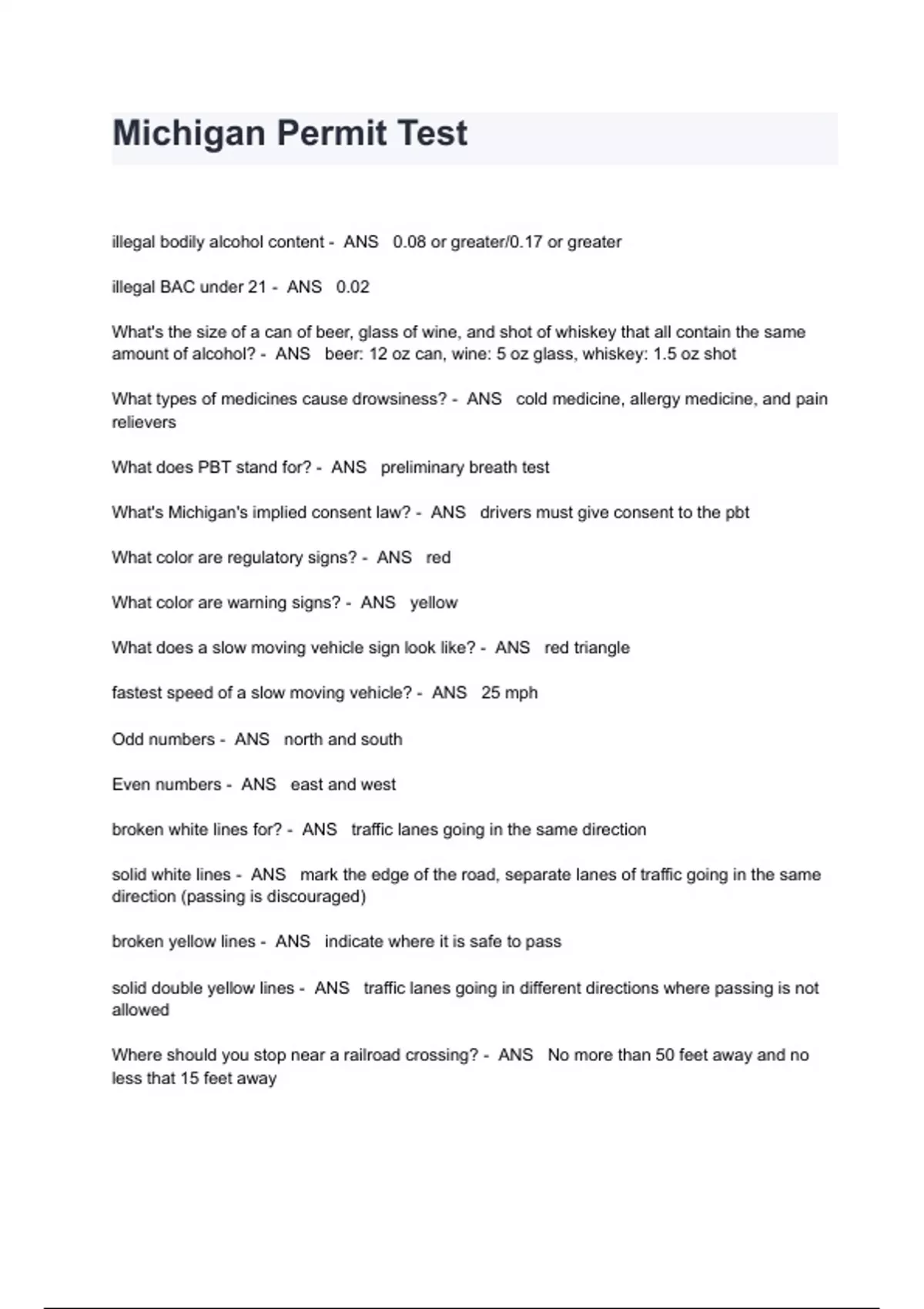 Michigan Permit Test Exam Questions And Answers illegal bodily alcohol content - ANS 0.08 or greater/0.17 or greater illegal BAC under 21 - ANS 0.02 What's the size of a can of beer, glass of wine, and shot of whiskey that all contain the same amount of alcohol? - ANS beer: 12 oz can, wine: 5 oz glass, whiskey: 1.5 oz shot What types of medicines cause drowsiness? - ANS cold medicine, allergy medicine, and pain relievers What does PBT stand for? - ANS preliminary breath test What's Michigan's implied consent law? - ANS drivers must give consent to the pbt What color are regulatory signs? - ANS red What color are warning signs? - ANS yellow What does a slow moving vehicle sign look like? - ANS red triangle fastest speed of a slow moving vehicle? - ANS 25 mph Odd numbers - ANS north and south Even numbers - ANS east and west
