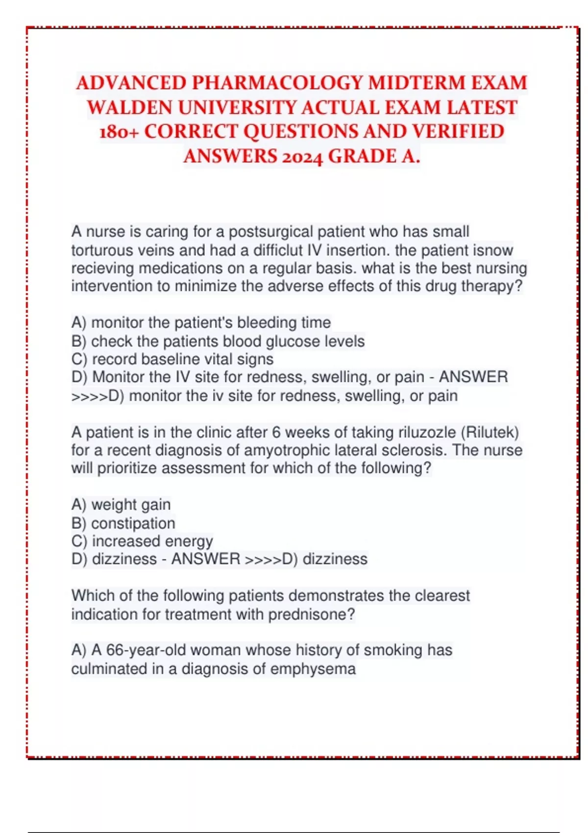 ADVANCED PHARMACOLOGY MIDTERM EXAM WALDEN UNIVERSITY ACTUAL EXAM LATEST 180+ CORRECT QUESTIONS AND VERIFIED ANSWERS 2024 GRADE A.