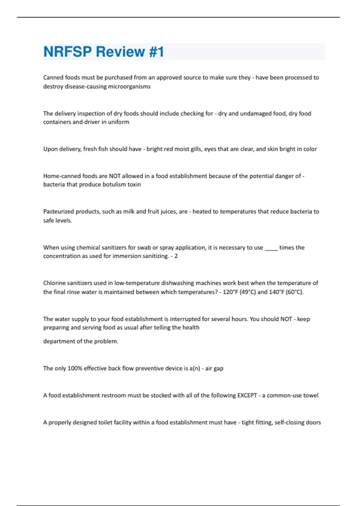 Canned foods must be purchased from an approved source to make sure they - have been processed to destroy disease-causing microorganisms The delivery inspection of dry foods should include checking for - dry and undamaged food, dry food containers and driver in uniform Upon delivery, fresh fish should have - bright red moist gills, eyes that are clear, and skin bright in color Home-canned foods are NOT allowed in a food establishment because of the potential danger of - bacteria that produce botulism toxin Pasteurized products, such as milk and fruit juices, are - heated to temperatures that reduce bacteria to safe levels. When using chemical sanitizers for swab or spray application, it is necessary to use ____ times the concentration as used for immersion sanitizing. - 2 Chlorine sanitizers used in low-temperature dishwashing machines work best when the temperature of the final rinse water is maintained between which temperatures? - 120°F (49°C) and 140°F (60°C). The water supply to your food establishment is interrupted for several hours. You should NOT - keep preparing and serving food as usual after telling the health department of the problem. The only 100% effective back flow preventive device is a(n) - air gap A food establishment restroom must be stocked with all of the following EXCEPT - a common-use towel A properly designed toilet facility within a food establishment must have - tight fitting, self-closing doorsA food service employee has a head cold with discharge from eyes and nose. What work activity would be acceptable for this employee? - removing garbage from the premises Brushes, mops, buckets, and other non-food items used in food prep areas should be - cleaned and sanitized every day The unit used for measuring chemical concentration in a sanitizing solution is - ppm In a HACCP system, a diagram of the path food takes from delivery to service is known as a - food model Floors in dry food storage areas should be cleaned and sanitized - as needed Time/Temperature Control (TCS) foods must be cooked to specific temperatures to - prevent contamination and cross contamination In a food establishment, where are cockroaches LEAST likely to be found? - on the sales floor Where are covered waste containers required? - in the ladies' restroom The initial symptoms of scrombroid poisoning include - numbness in mouth and fingers